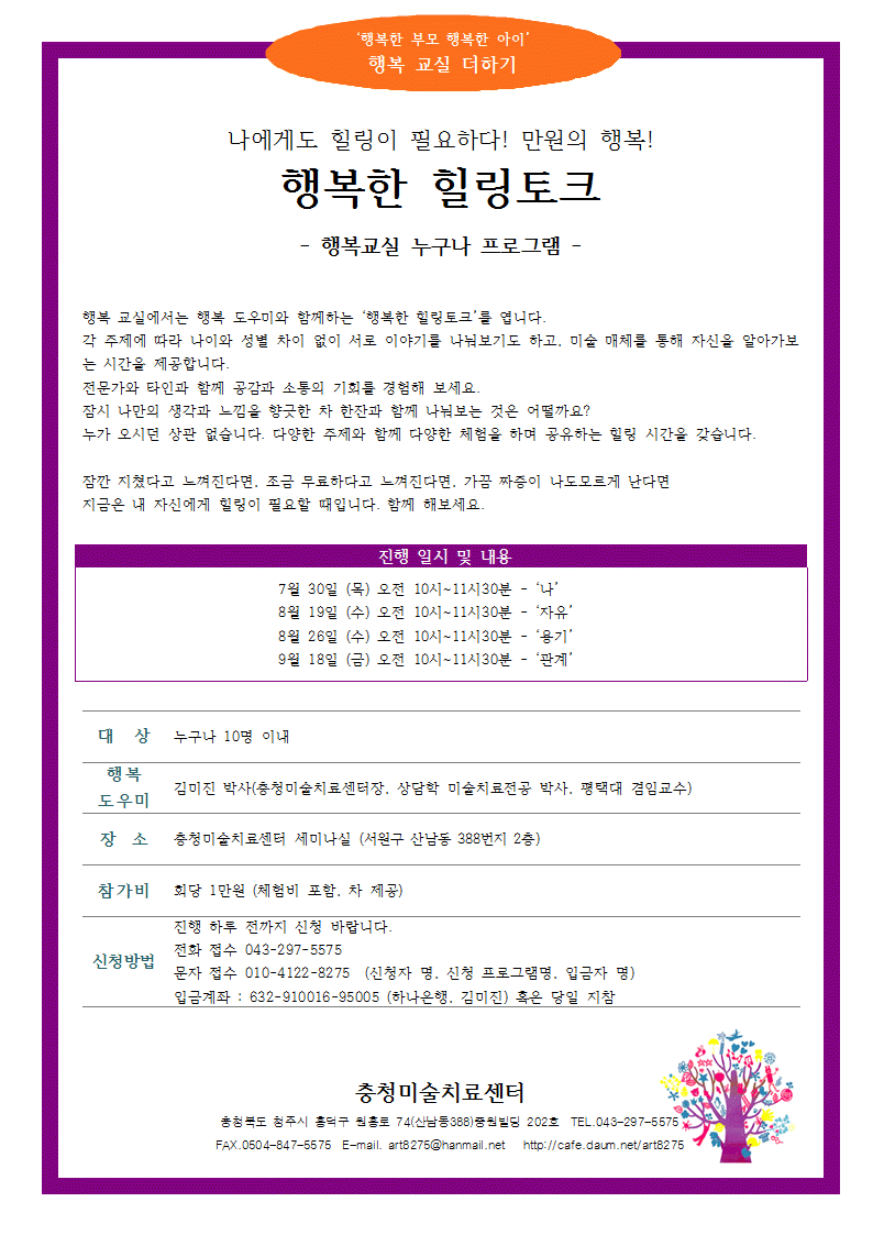 만원의 행복! 행복한 힐링토크 - 행복교실 누구나 프로그램- 작성자김미진(행복지기)|작성시간15.07.20|조회수45 목록 댓글 0 글자크기 작게가 글자크기 크게가 다음검색 현재 게시글 추가 기능 열기 북마크 공유하기 신고 센터로 신고 댓글 댓글 0 댓글쓰기 답글쓰기 댓글 리스트