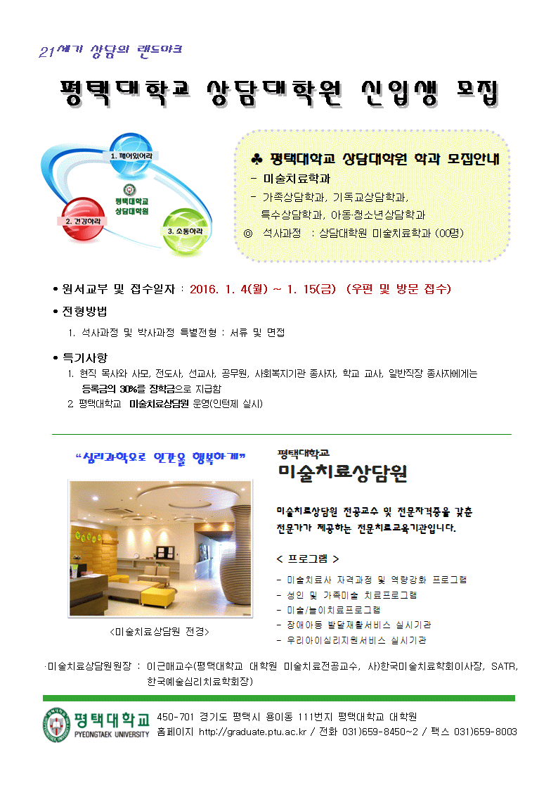 2016년 평택대학교 상담대학원 미술치료학과 신입생 모집 작성자김미진(행복지기)|작성시간15.12.24|조회수75 목록 댓글 0 글자크기 작게가 글자크기 크게가 다음검색 현재 게시글 추가 기능 열기 북마크 공유하기 신고 센터로 신고 댓글 댓글 0 댓글쓰기 답글쓰기 댓글 리스트