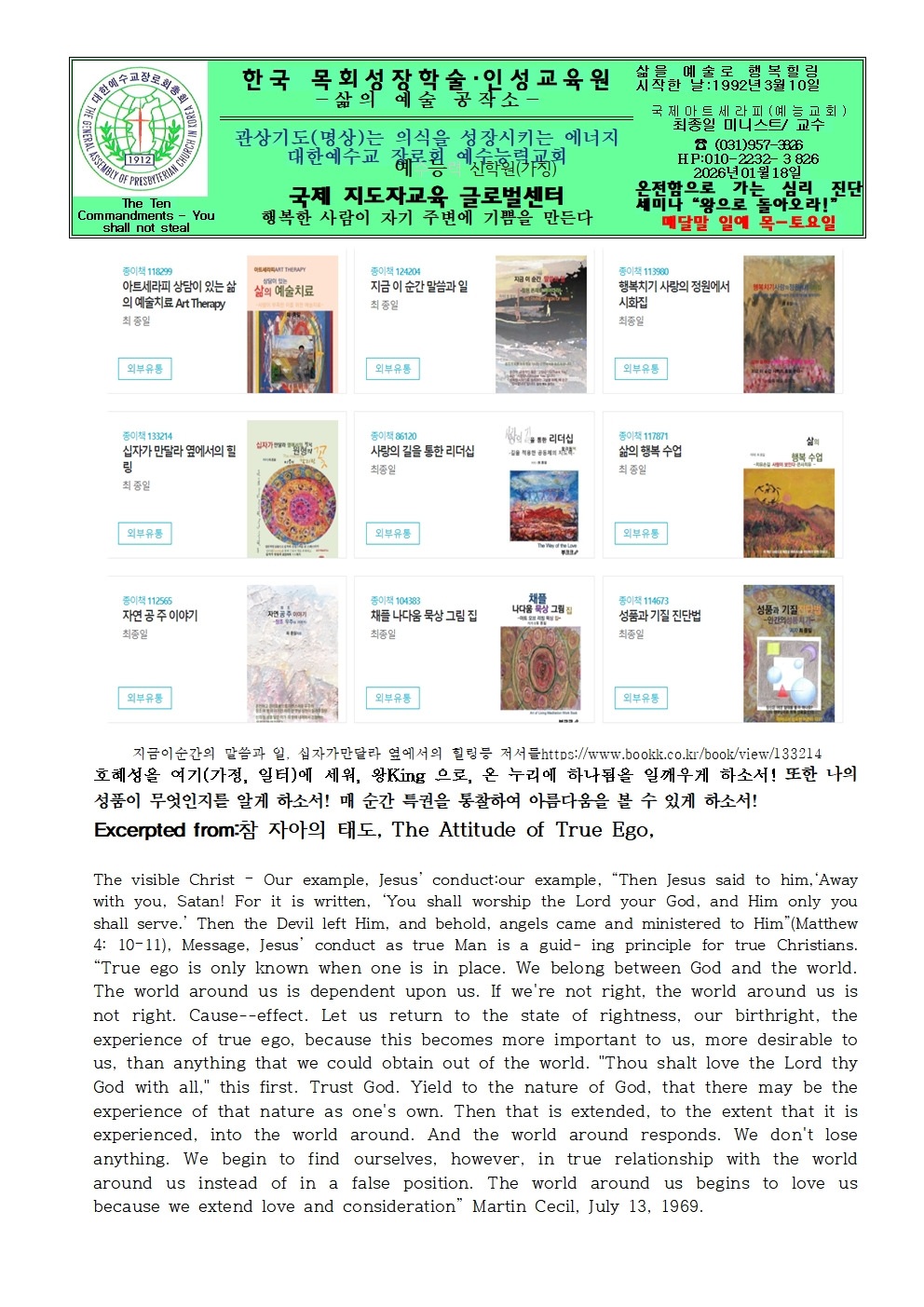 이번주의 말씀과 숙고로 1월26일, 호혜성을 여기(가정, 일터)에 세워, 성숙한 왕King,ㆍ참된 목회자로 온전하게 돌아오게 하시고, 온 누리에 하나됨을 일깨우게 하소서! 나의 성품이 무엇인지를 알게 하여! 매 순간 특권을 통찰하여 회개하여 아름다움을 볼 수 있게 하소서! Excerpted from:창조의 기쁨, The Joy of Creation, 주님과의 교제 - 기억과 선포, 주님을 선포하는 것으로, “그러므로 여러분이 이 빵을 먹고 이 잔을 마실 때마다, 주님의 죽으심을 그가 오실 때까지 선포하는 것입니다”(고린도 전서 11:26);전 언. 성만찬의 기념은 예수님의 죽으심을 선포하는 사명과 관련이 있습니다. “예수께서 “보라, 나는 너희와 함께 있겠고 이 세상 끝까지 함께하겠다.”고 말씀하셨는데 이는 이 땅, 이 지구의 끝이 아니라 인간의 파괴성, 인간의 자기 중심성의 끝까지 라는 말입니다. " 자신의 권리를 양보하거나 때로는 갈라서는 방법도 있습니다. 그리하여 불화는 하나님과 인류 간에 이것은 그리스도의 희생이였습니다. -이 희생은 우리가 평화주의자가 되는 필수조건입니다. 오래전에 주님은 “판단하지 말라”는 우리에게 주신 가르침으로, “아버지, 그들을 용서하세요. 그들이 하는 것을 그들은 알지 못하기 때문입니다.” 그들이 화평에 소속된 곳에 있지 않기에, 인류는 이 땅에서 일어나는 것을 알지 못합니다. "내가 여호와를 기다리고 기다렸더니 귀를 기울이사 나의 부르짖음을 들으셨도다"(시40:1). 불화의 것에 회복된 것으로 "이는 보좌 가운데에 계신 어린 양이 그들의 목자가 되사 생명수 샘으로 인도하시고 하나님께서 그들의 눈에서 모든 눈물을 씻어 주실 것임이라"(요한계시록 7: 17). 평화를 만들어내는 사람이 되는 것이 위해 우리는 창조 흐름을 그냥 내버려두는 것을 배워야 합니다. 기다리며 있는 그대로 흐르도록 합니다. - 주여 우리에게 축복을 주소서. 하나님의 삶 속에서도 진리로: 우리를 둘러 싼 세계와 참된 관계 안에 있는 자신을 발견하게하여 우리를 사랑하며 배려들로 지금 모두가 행복하게 하소서. 제134회 온전함으로가는 실습 워크숍을 1월29일 목요일 오후 2시-5,시, 금요일10시30분부터12시까지 장소는 파주시 광탄면 큰여울길21-11(글로벌센터2층)010-2232 3826, 한국목회 인성 성장 교육 3차 세미나 -“인성을 키우는 ‘드림유니크’ 성품자가진단법 실습세미나2. 채플 삶의 예술세미나-, 드림유니크, 인성교육 마음힐링 심포지엄을 마지막 주 2박3일(금5시-토, 일 5시까지) 최 종일 010-5393-3826, *참된 존재로 나 자신이 주도적으로 묵상하며 사랑합시다. 책 소개- 묵상, 쉼, 힐링 칼라링(e퍼플)전자북, 채플 나다움 묵상 그림 집, 사랑의 길을 통한 리더십(부크크), 성품자가진단법, 행복치기 사랑의 정원에서 시화집, 지금 이 순간 말씀과 일 등 최종일저 십자가 만달라 옆에서의 힐링, 인성을 키우는 드림 유니크,