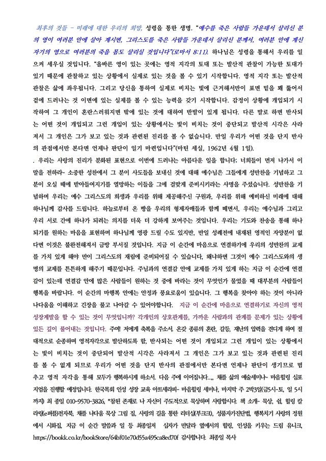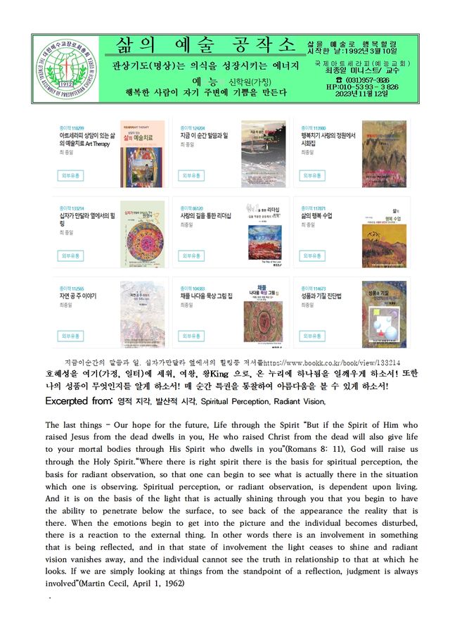 이번주의 기도 11월12일- 호혜성을 여기(가정, 일터)에 세워, 여왕, 왕King 으로, 온 누리에 하나됨을 일깨우게 하소서! 또한 나의 성품이 무엇인지를 알게 하소서! 매 순간 특권을 통찰하여 아름다움을 볼 수 있게 하소서! 최후의 것들 – 미래에 대한 우리의 희망, 삼위일체의 하나님 성령을 통한 생명이 거듭남으로, 예수님의 십자가에서 죽으신 가운데 부활하셨습니다. 우리는 부활의 몸을 받기 위해 은혜가 필요합니다. 주여! 저에게 축복을 주소서. 온갖 종류의 혼란, 갈등, 재난의 압력을 견디게 하여 절대적으로 순종하며 영적자각으로 발산하도록 함, 반사되는 어떤 것이 개입되고 그런 개입이 있는 상황에서는 빛이 비치는 것이 중단되어 발산적 시각은 사라져서 그 개인은 그가 보고 있는 것과 관련된 진리를 볼 수 없게 되므로 우리가 어떤 것을 단지 반사의 관점에서만 본다면 언제나 판단이 생기므로 멈추고 영적 자각을 통해 모두가 행복하시게 하소서. 다음 주에 이어집니다..,, 채플 삶의 예술세미나- 마음힐링 심포지엄을 진행할 예정입니다. 한국목회 인성 성장 교육 아트세라피- 마음힐링 세미나, 마지막 주 2박3일(금5시-토, 일 5시까지) 최 종일 010-9570-3826, *참된 존재로 나 자신이 주도적으로 묵상하며 사랑합시다. 책 소개- 묵상, 쉼, 힐링 칼라링(e퍼플)전자북, 채플 나다움 묵상 그림 집, 사랑의 길을 통한 리더십(부크크), 성품자가진단법, 행복치기 사랑의 정원에서 시화집, 지금 이 순간 말씀과 일 등 최종일저 십자가 만달라 옆에서의 힐링, 인성을 키우는 드림 유니크, https://bookk.co.kr/bookStore/64bf01e70d55a495ca8ed70f 감사합니다. 최종일 목사