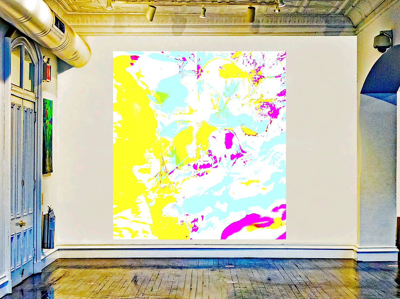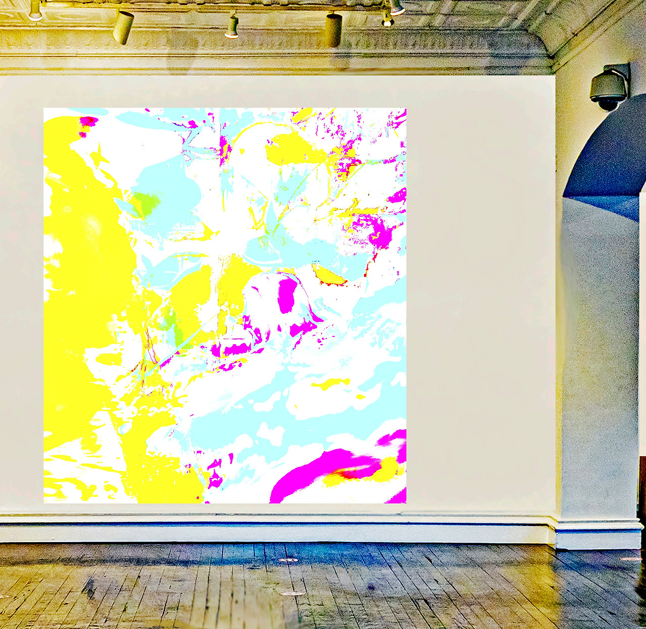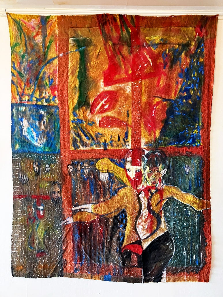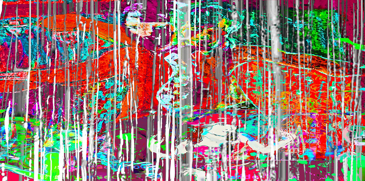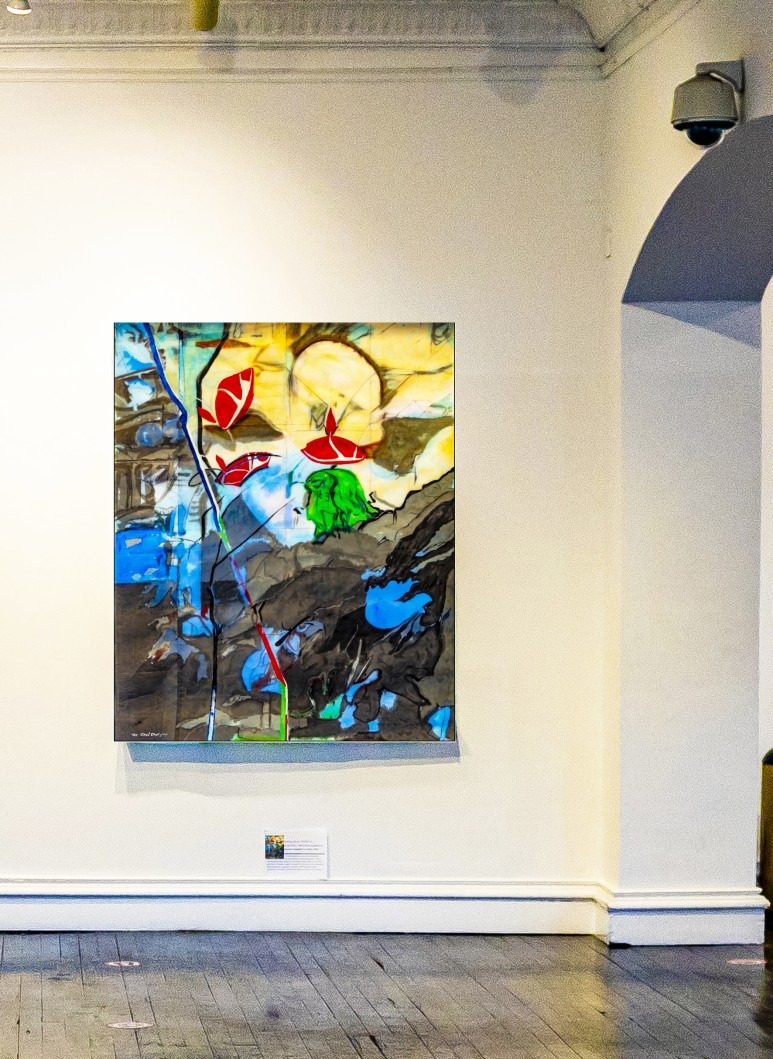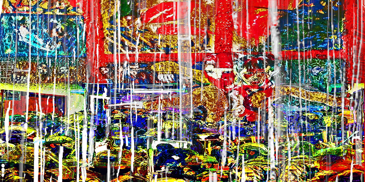 Final image superimposed on the artist's work:: Louis Chul-joo Choi, the Missing pond, 112X249cm, acrylic and composite materials on cloth, 2024