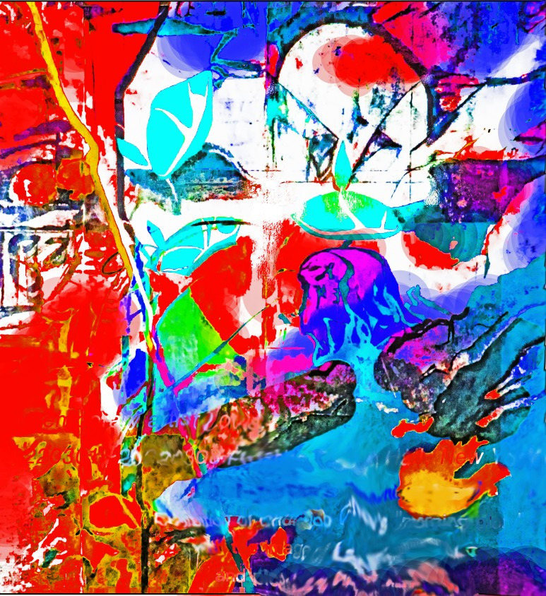 그 생각은 무의식과 언어를 동일한 형상을 그려낸 하나의 추상적 이미지다. 여기서 응시로 보이는 나팔꽃은 하나의 색깔로 평면화된 왜상적 구조다. 이것은 라캉적 개념미술 추상화에서 나팔꽃이라는 일관된 의미로 보이게 있는 왜상적 평면성이다. 그 평면적 나팔꽃 형상은 거울에 비친 실재(le réel)와 동일하지만 가역적 빛의 음영으로 비친 배경의 형상은 동일하지 않는 개념미술로 본 추상적 거울 이미지다.