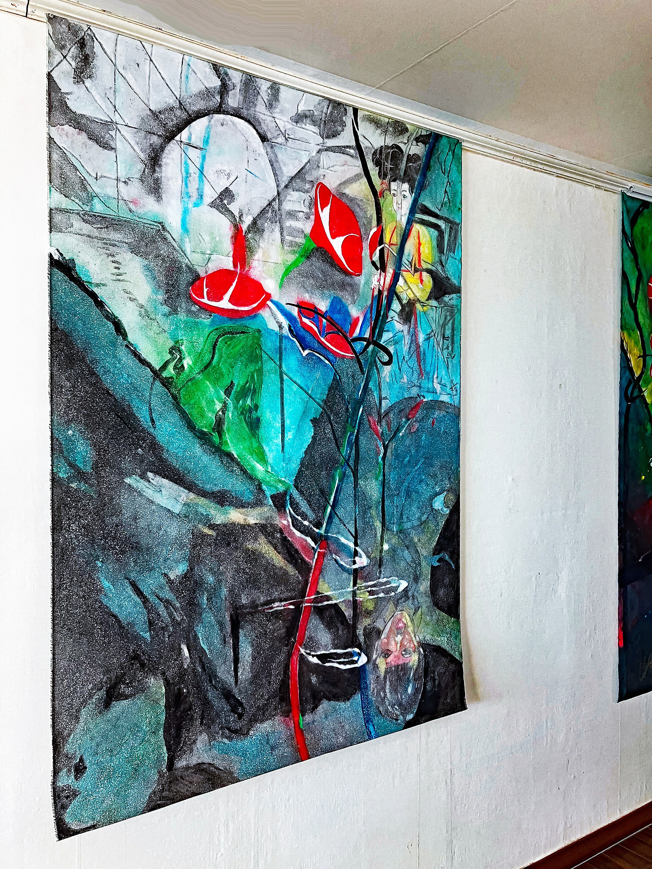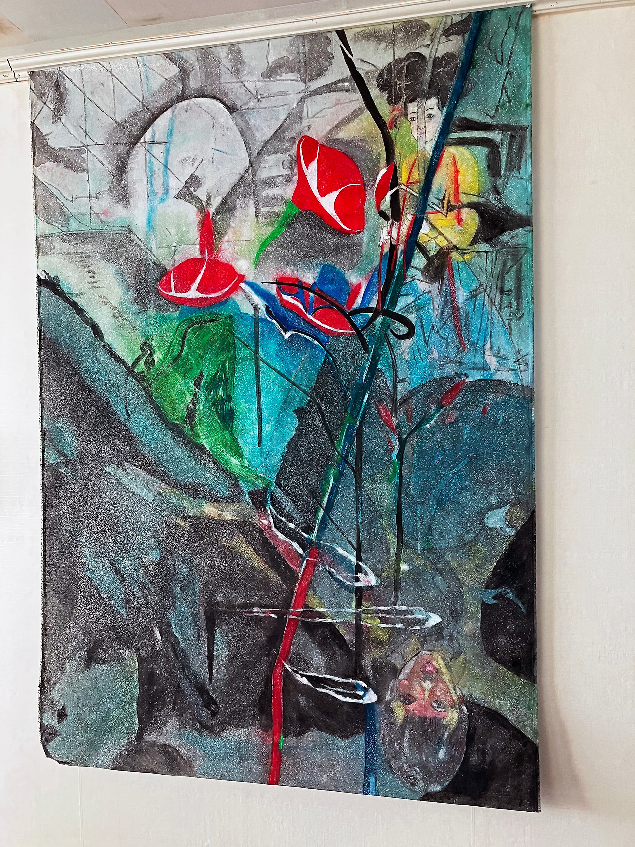 Final image superimposed on the artist's work:: Louis Chul-joo Choi, the Missing pond, 112X249cm, acrylic and composite materials on cloth, 2024: