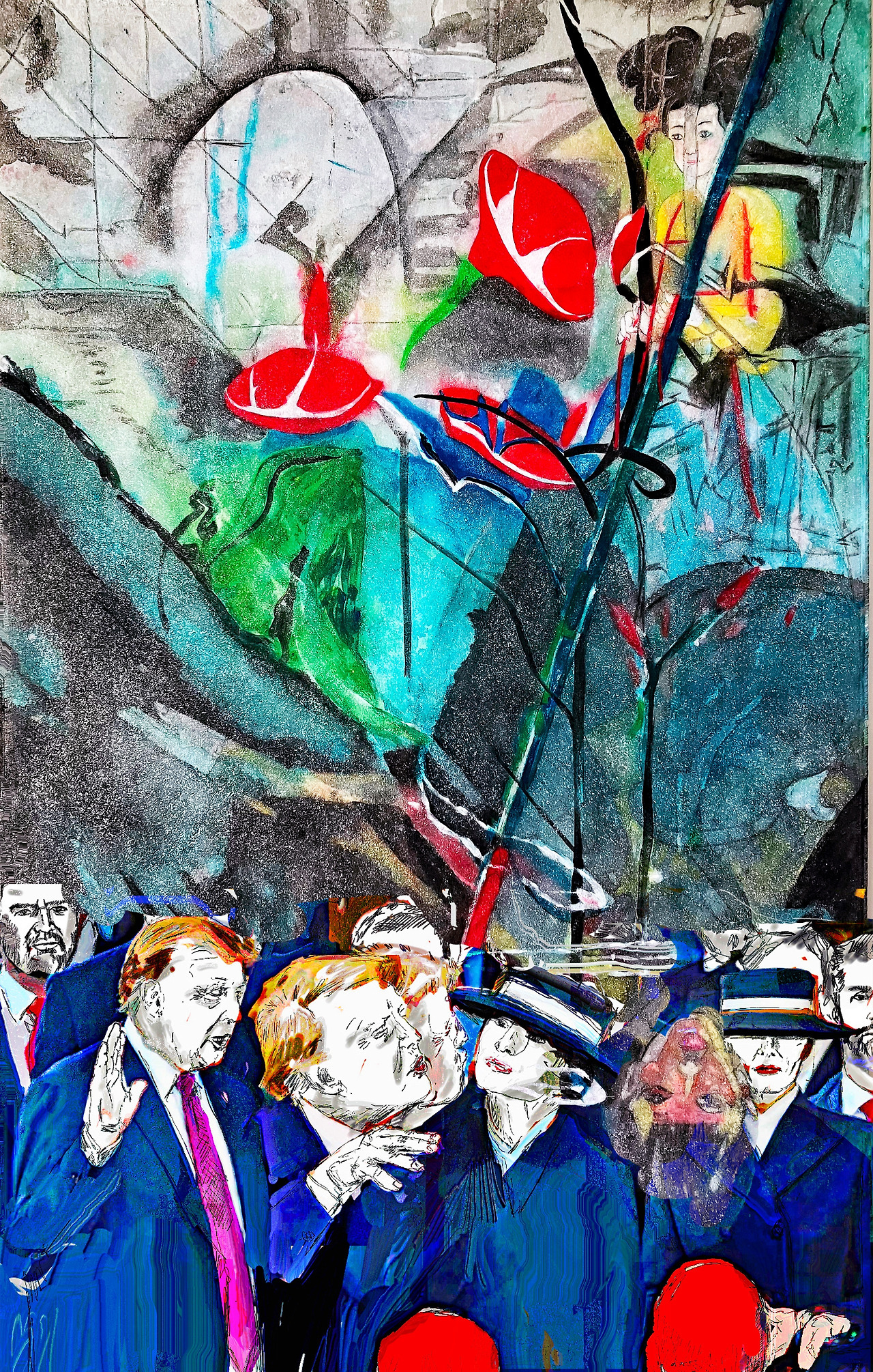 This translates to the first non-realistic abstraction poster at Louis Choi Chul-joo's 2022 New York Exhibition to actualize the Desire Object. The image <Louis Choi chuljoo, morning glory p132-4-Trump Sets Mission To America First As U.S. President> becomes a non-real abstraction of reality.