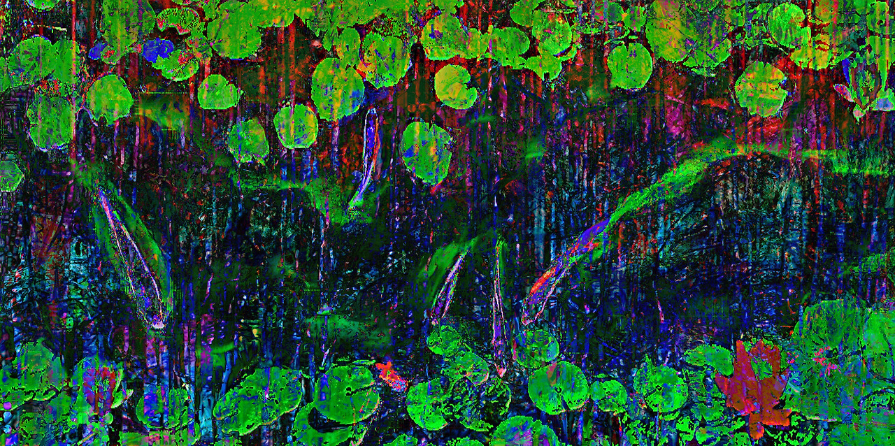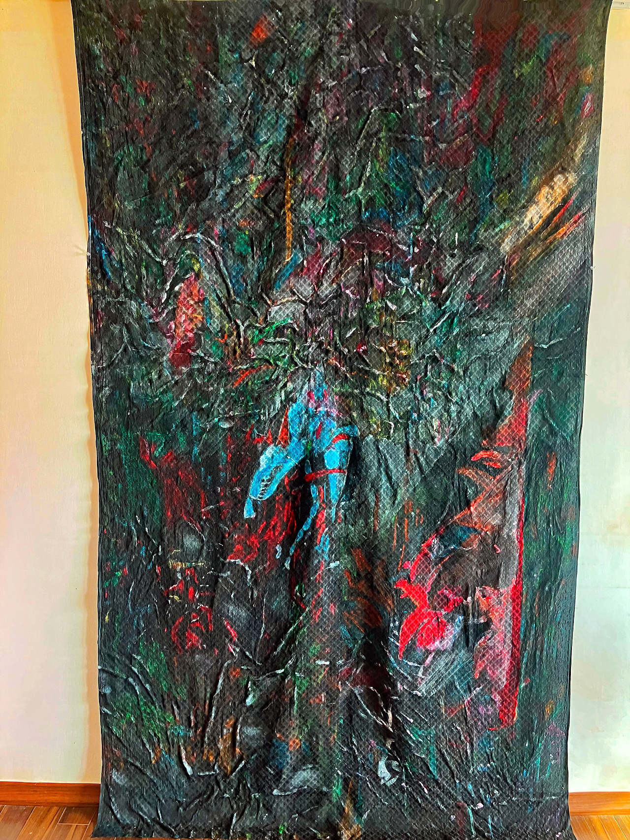 Final image superimposed on the artist's work:Louis Chul-joo Choi, a missing pond, 112X249cm, acrylic and composite materials on cloth, 2024