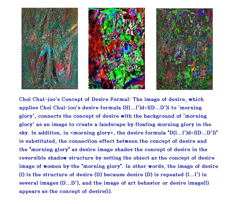 Desire Concept Realistic Abstract Work: Louis Choi chuljoo, morning glory Louis Chul-joo Choi, morning glory p125-2-1-2024 U.S. presidential candidate,: By repeatedly applying the concpept of imaginary world and desire and Choi Chul-joo's desire formula <D(I...I')d=I(D...D'i)i> to the image of the work, it acquires aesthetic value and reveals its meaning by realizing formability in the shadow of reversible light. / The meaning of the shape, which is covered by the actual changed instantaneous movement of the shape, results in linguistic abstraction. In other words, the realistic shape of the other person's desire in a momentary event is a linguistic abstraction of the same meaning. Conceptual art with morning glory and bamboo as cultural background is linguistic abstraction. The abstract creates a conceptual structure based on the shape of subsequent reality fostered by language and hides the desire of others in a momentary event.