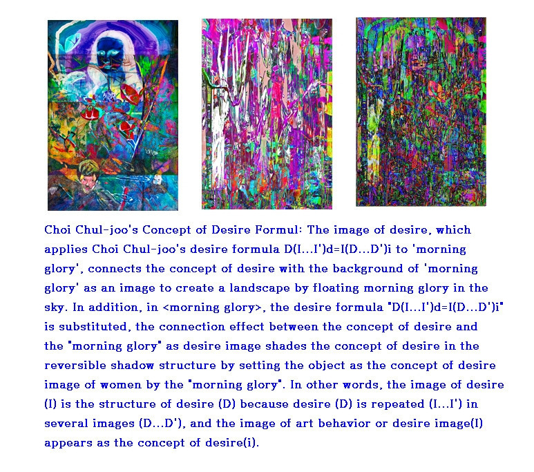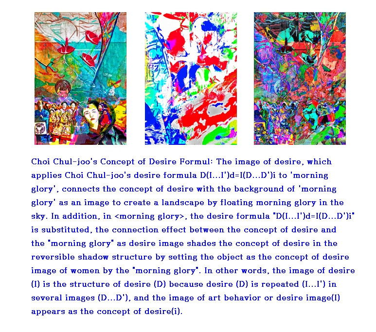 mathematical desire as an axiom of logic in the concept of desire results in reality as a concrete phenomenon rather than based on the external structure of the linguistic meaning through abstract design. Therefore, the rendering of the desire structure revealed by abstract encounter with reality at the intersection of desire outside the window applies the mathematical desire concept abstract design, or the image of the desire concept, to the Choi Chul-joo desire formula, and on March 1, 2022, morning glory appears as a flat real image as the subject of desire as a reversible shade of light in the Flushing Town Hall (New York) exhibition./ The image of desire, which applies Choi Chul-joo's desire formula D(I...I')d=I(D...D')i to 'morning glory', connects the concept of desire with the background of 'morning glory' as an image to create a landscape by floating morning glory in the sky. In addition, in <morning glory>, the desire formula "D(I...I')d=I(D...D')i" is substituted, the connection effect between the concept of desire and the "morning glory" as desire image shades the concept of desire in the reversible shadow structure by setting the object as the concept of desire image of women by the "morning glory". In other words, the image of desire (I) is the structure of desire (D) because desire (D) is repeated (I...I') in several images (D...D'), and the image of art behavior or desire image(I) appears as the concept of desire(i).
