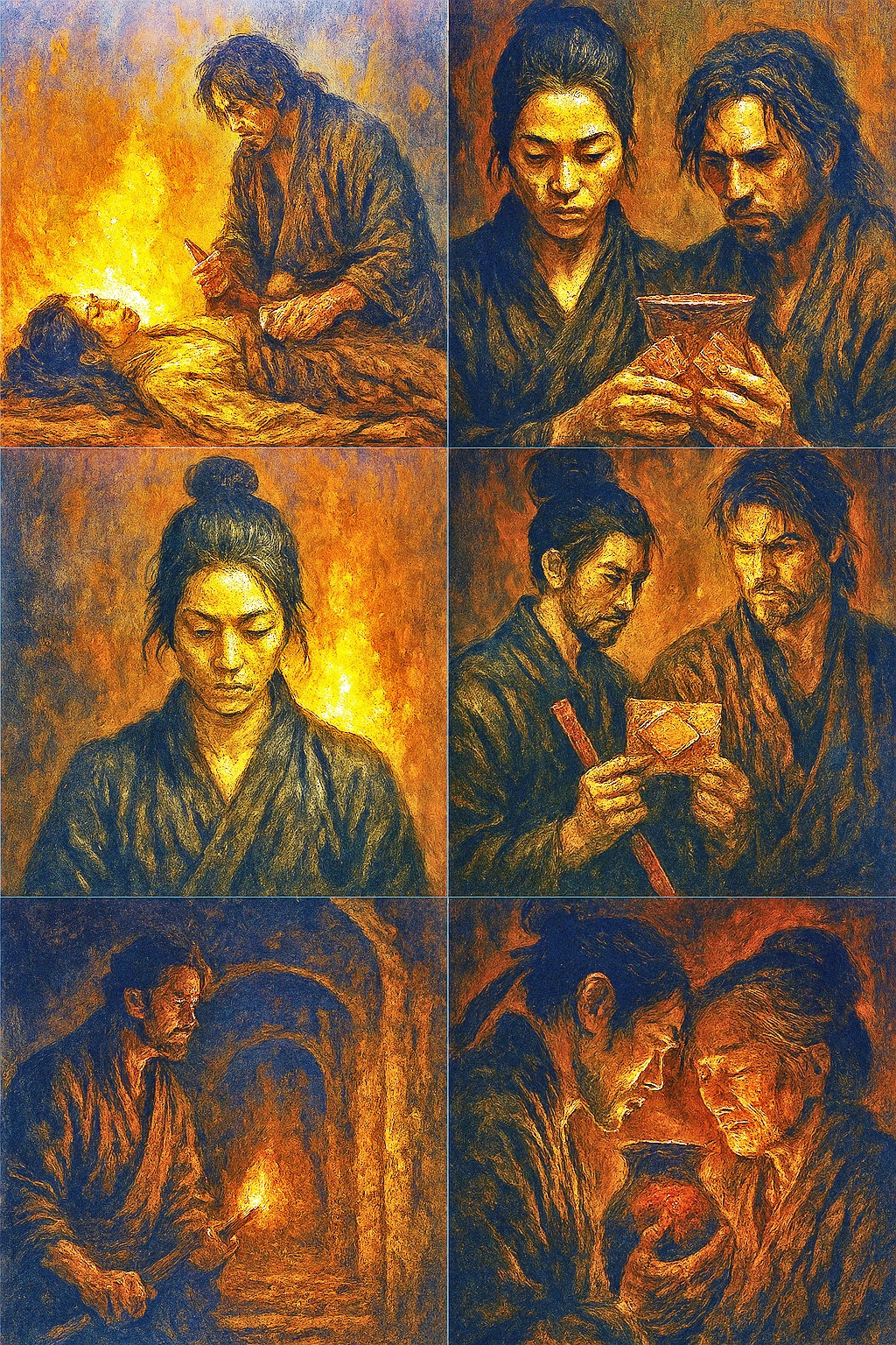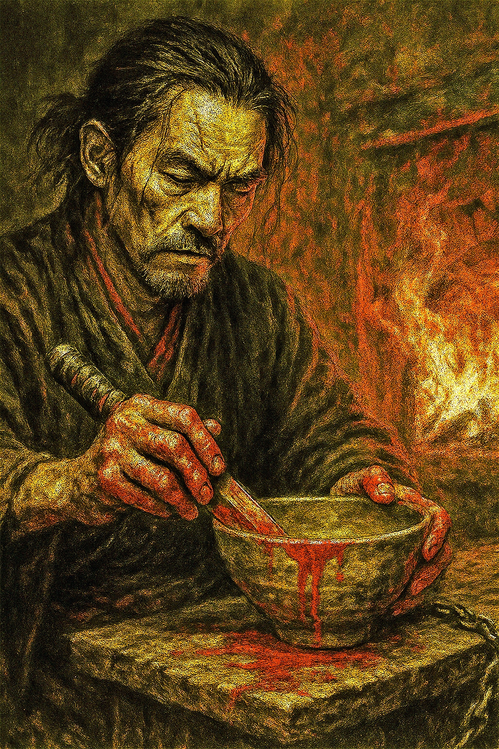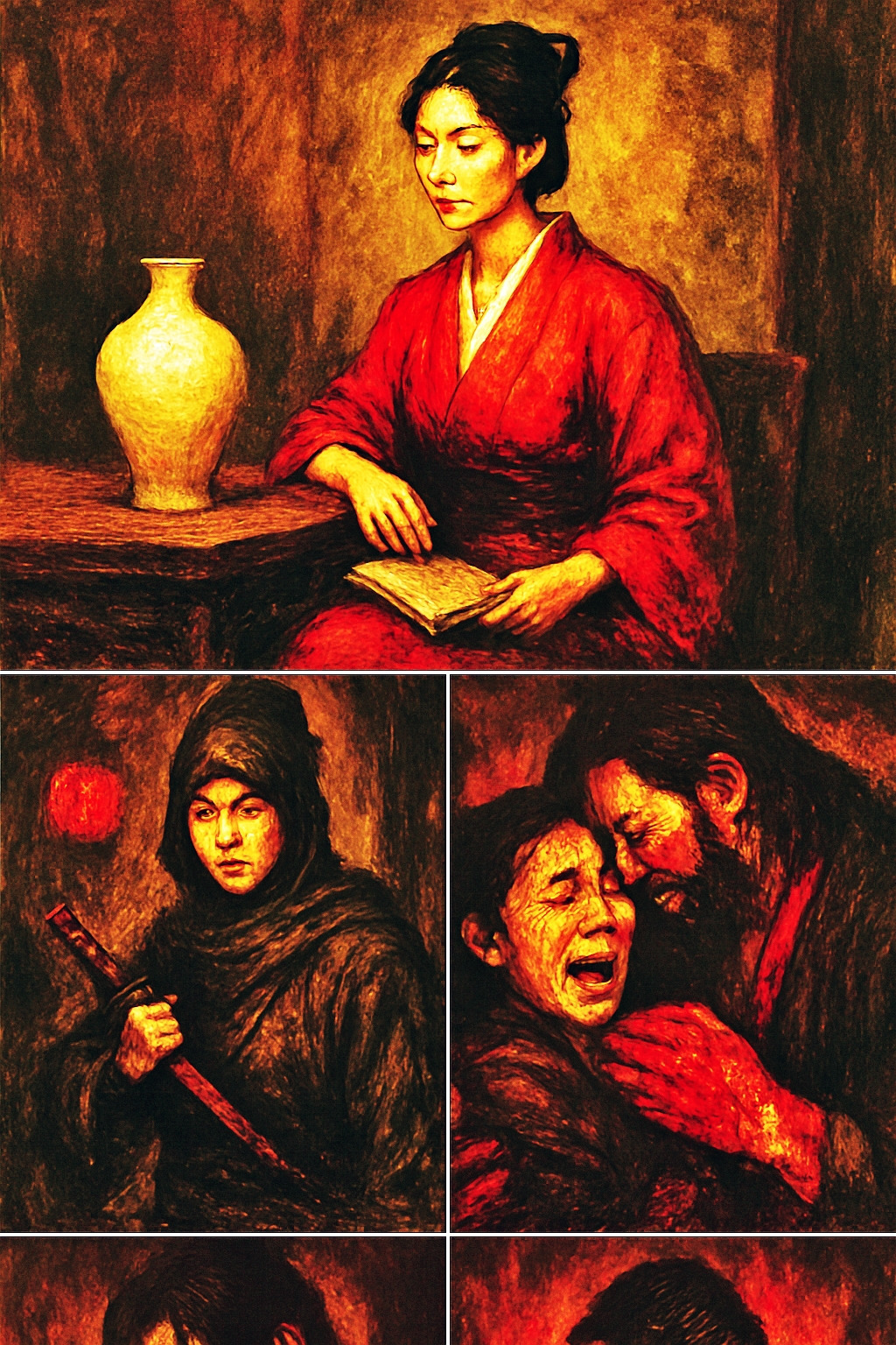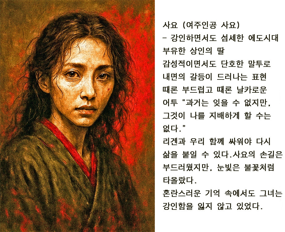 에도, 어느 늦은 밤. 가마 불이 붉게 타오릅니다. 리젠은 피투성이가 된 손으로 도자기를 만들고 있습니다. 그의 눈은 무표정하지만 손끝은 떨리고 있습니다. 붉은 점토에 피가 스며들고 도자기는 살아있는 심장처럼 맥동합니다.