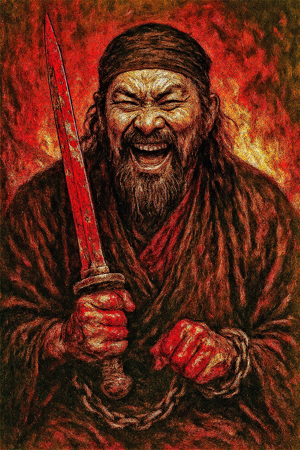 His brutal eyes, bloodied sword and chain, the symbol of human trafficking, visually capture his ambition to seize power in the storm.