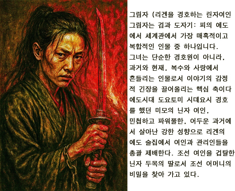 그림자, 옥상 위로. 검은색 닌자 수트를 입은 그녀는 리젠의 바를 주시하고 있습니다. 리젠을 지키는 임무를 맡고 있지만 리젠을 주시해야 하는 또 다른 이유가 있습니다. 어머니가 남긴 마지막 유물인 조선 도예 도자기입니다. 도자기와 리젠의 작품은 매우 비슷해 보였습니다.