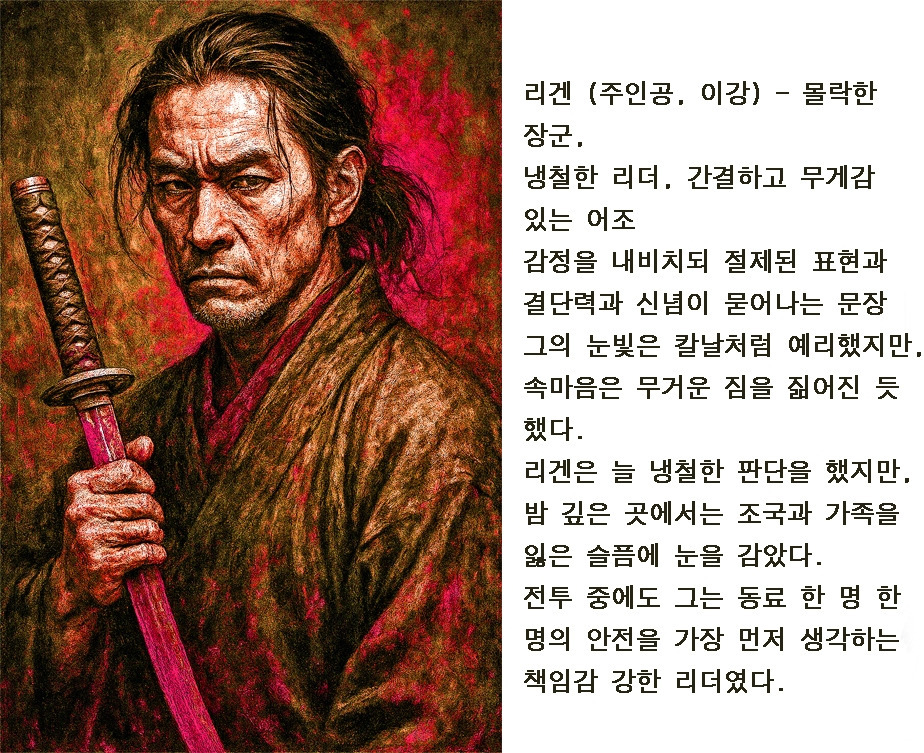 컷 1 / 배경: 조선 시골, 폐허가 된 집 앞에 서 있는 장군 리겐