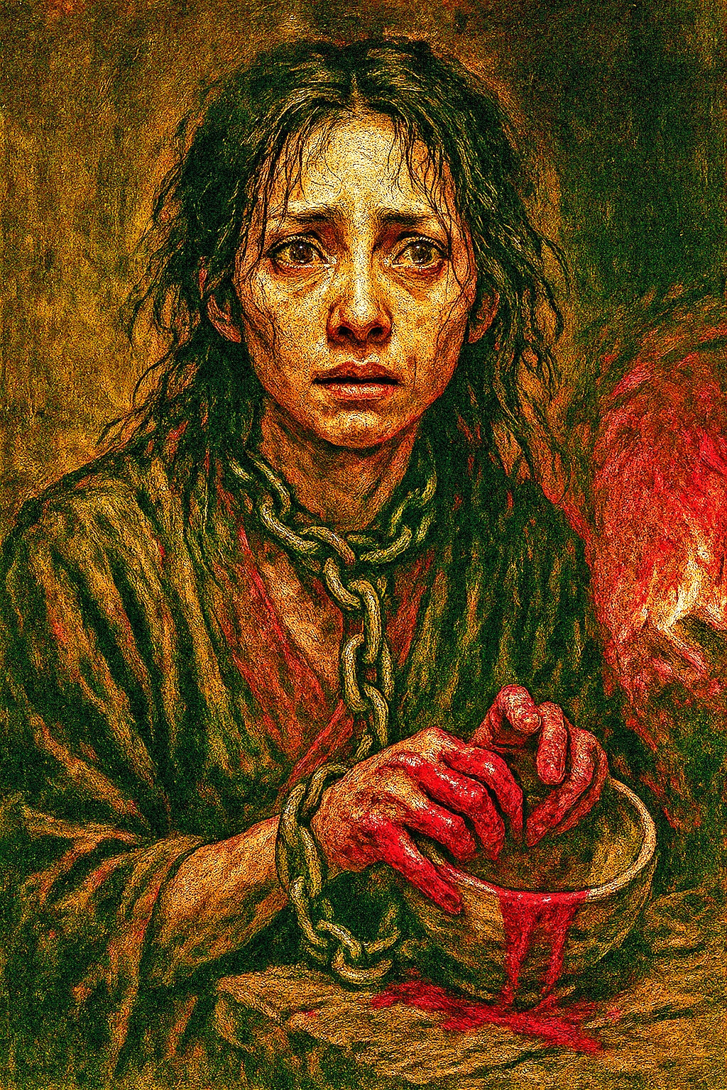 Her appearance in the dark, chained, is visually condensed from fear and despair to the shock of learning the hidden truth of Regen