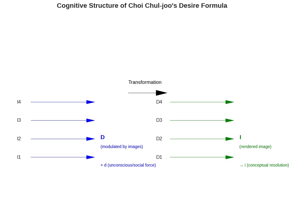 � reflects internal cognitive forces—memory, imagination, and intersubjective projection—that drive this transformation. Conversely, I(D...D') models how abstract structures of desire are re-rendered into perceptual images, which are then cognitively categorized as conceptual desire (D).