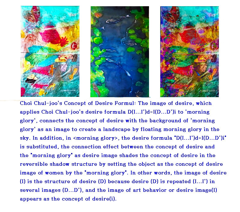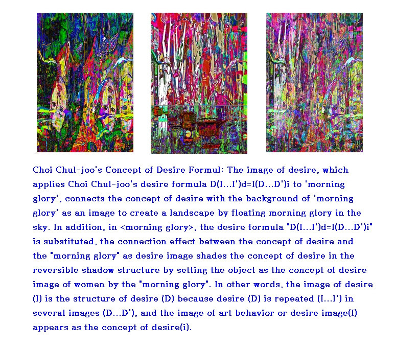 최철주의 욕망 공식 D(I...I')d=I(D...D')i 이 ‘나팔꽃’ 이미지에 적용될 때, 이는 욕망의 개념과 ‘나팔꽃’이라는 배경 이미지 사이의 연결을 통해 하늘에 나팔꽃을 띄움으로써 하나의 상징적 풍경을 창조하는 시각적 구조로 작동하며, 이 공식은 단순한 시각적 재현을 넘어 욕망의 구조를 반복적 이미지와 상호작용하는 수학적·인지적 체계로 정식화하는 방식으로 이해될 수 있다. 특히 작품 <morning glory>에서는 욕망 공식이 대입되어, 욕망 개념과 ‘나팔꽃’이라는 욕망 이미지 사이의 연결 효과가 가역적 그림자 구조 속에서 욕망 개념을 음영 처리하며, 여기서 ‘나팔꽃’은 여성의 욕망 이미지 개념으로 설정된 객체로 작동한다. 다시 말해, 욕망의 이미지(I)는 욕망의 구조(D)를 구성하는데, 이는 욕망(D)이 여러 이미지(I...I') 속에서 반복되며, 그 이미지들이 다시 욕망의 구조(D...D')를 반영하기 때문에, 예술적 행위의 이미지 또는 욕망 이미지(I)는 결국 욕망 개념(i)으로 출현하게 되며, 이러한 구조는 라캉의 ‘타자의 욕망’과 프로이트의 ‘무의식적 반복’ 개념을 시각적으로 구현하는 동시에, 인간 인지가 욕망을 어떻게 상징적 구조와 반복적 이미지 속에서 구성하고 인식하는지를 보여주는 인지 공학적 시뮬레이션으로 해석될 수 있다.