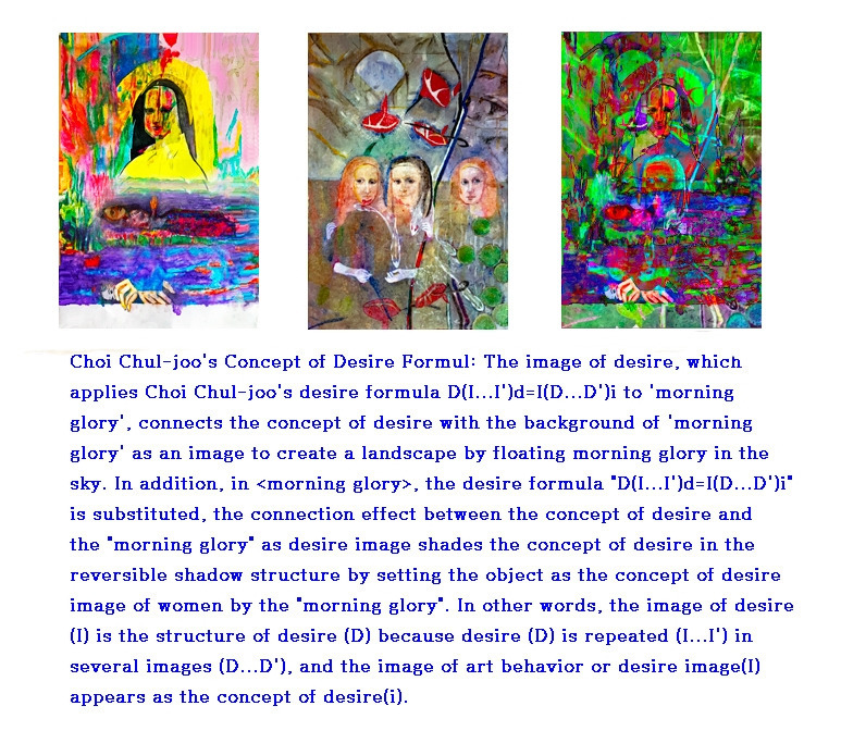 Here is a refined and cohesive academic-style interpretation of your concept, written in English from the perspective of a cognitive scientist with psychoanalytic insight: Choi Chul-joo’s application of the desire formula D(I...I')d=I(D...D')i to the image of “morning glory” constructs a symbolic landscape in which the flower floats in the sky, visually linking the abstract concept of desire with its aesthetic background. This formula operates as a cognitive and psychoanalytic mechanism, wherein the image of desire (I) is not merely a representation but a structural repetition of desire (D) across multiple visual instances (I...I'), which themselves reflect the recursive nature of desire (D...D'). In this framework, the “morning glory” becomes both the object and the medium through which desire is shaded, refracted, and rendered in reversible shadow structures—particularly when the object is configured as the feminine image of desire. The substitution of the formula within the artwork <morning glory> reveals a layered interplay between symbolic abstraction and visual cognition, where the image of artistic behavior or desire (I) emerges as the conceptual form of desire (i), thus collapsing the boundary between representation and structure. From a psychoanalytic perspective, this recursive logic mirrors Lacan’s notion that desire is constituted through the gaze of the Other and Freud’s view that desire is driven by unconscious repetition and symbolic substitution. Cognitively, the formula encodes how the mind processes desire not as a static object but as a dynamic system of mirrored images and temporal shadows, ultimately transforming abstract longing into a visual syntax of emotional architecture.