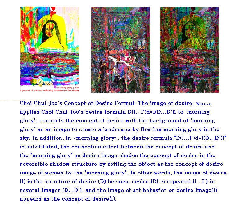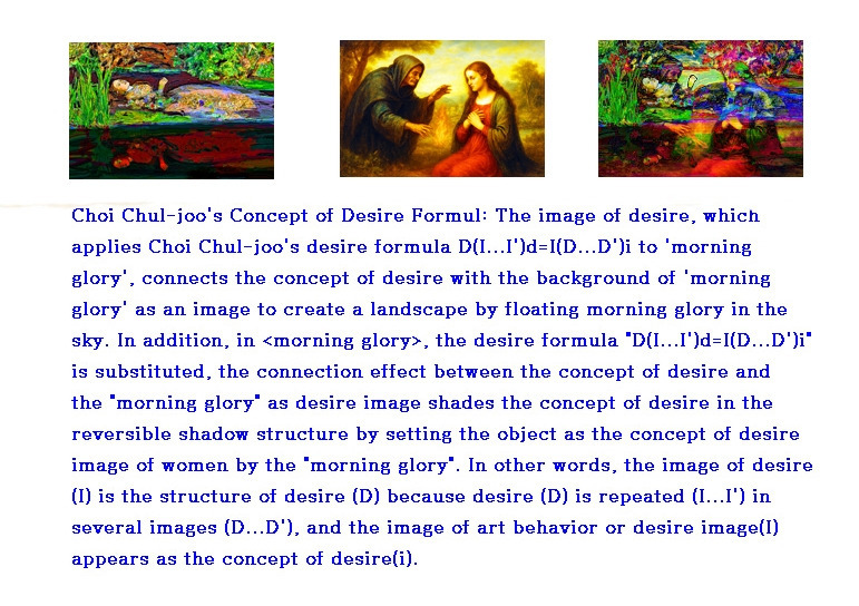 Choi Chul-joo’s application of the desire formula "D(I...I')d=I(D...D')i" to the image of “morning glory” constructs a symbolic landscape in which the flower floats in the sky, visually linking the abstract concept of desire with its aesthetic background. This formula operates as a cognitive and psychoanalytic mechanism, wherein the image of desire (I) is not merely a representation but a structural repetition of desire (D) across multiple visual instances (I...I'), which themselves reflect the recursive nature of desire (D...D'). In this framework, the “morning glory” becomes both the object and the medium through which desire is shaded, refracted, and rendered in reversible shadow structures—particularly when the object is configured as the feminine image of desire. The substitution of the formula within the artwork <morning glory> reveals a layered interplay between symbolic abstraction and visual cognition, where the image of artistic behavior or desire (I) emerges as the conceptual form of desire (i), thus collapsing the boundary between representation and structure. From a psychoanalytic perspective, this recursive logic mirrors Lacan’s notion that desire is constituted through the gaze of the Other and Freud’s view that desire is driven by unconscious repetition and symbolic substitution. Cognitively, the formula encodes how the mind processes desire not as a static object but as a dynamic system of mirrored images and temporal shadows, ultimately transforming abstract longing into a visual syntax of emotional architecture.