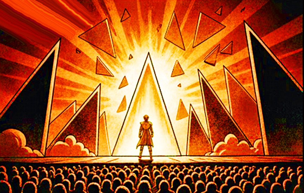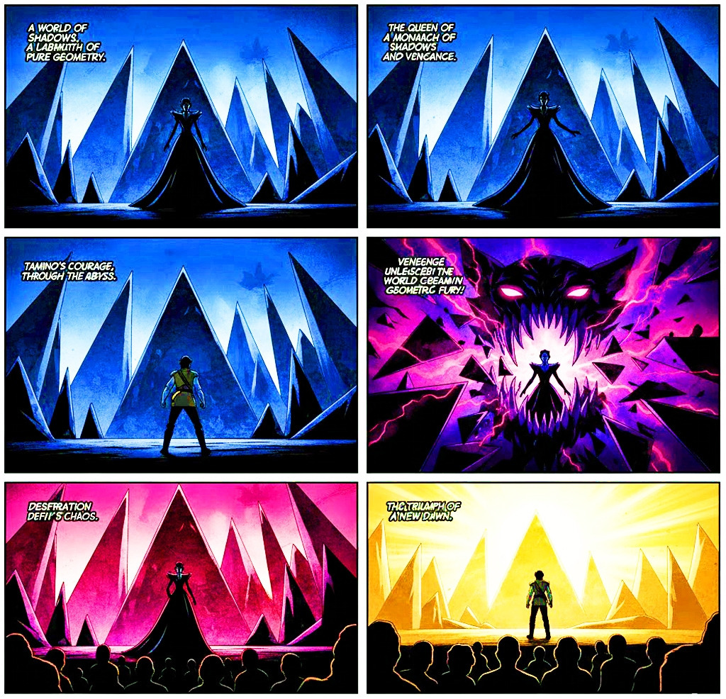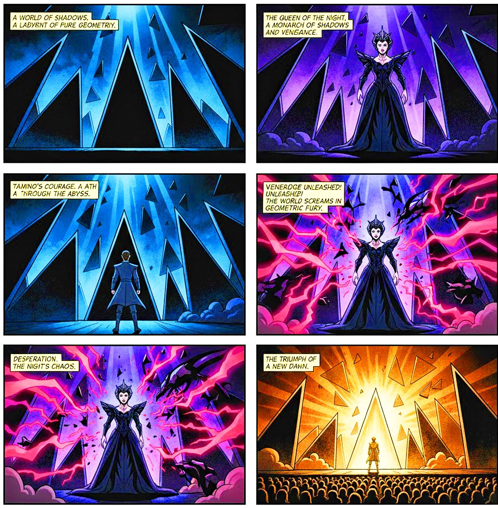 루이가 자신의 서사적인 밤을 기하학적 추상 구조로 정리하고 개념적인 밤을 입는 '마법피리'의 무대 예술은 더 이상 전통적인 천상 세계나 밤의 여왕을 상징하는 동양의 신비주의가 아닙니다. 그는 밤의 여왕의 권력을 삼각형이라는 가장 원시적이고 날카로운 기하학적 단위로 대체하여 악의 본질을 시각적 서사가 아닌 개념적 구조로 재정의했습니다. 무대를 가득 채운 검은 피라미드는 최철주의 '욕망개념화' 이론에서 언급된 보이지 않는 위협의 시각화를 완벽하게 수행합니다. 이는 관객들이 밤의 여왕을 하나의 인물이 아닌 '구조적 폭력' 그 자체로 인식하게 하여 타미노의 이성을 압박합니다.