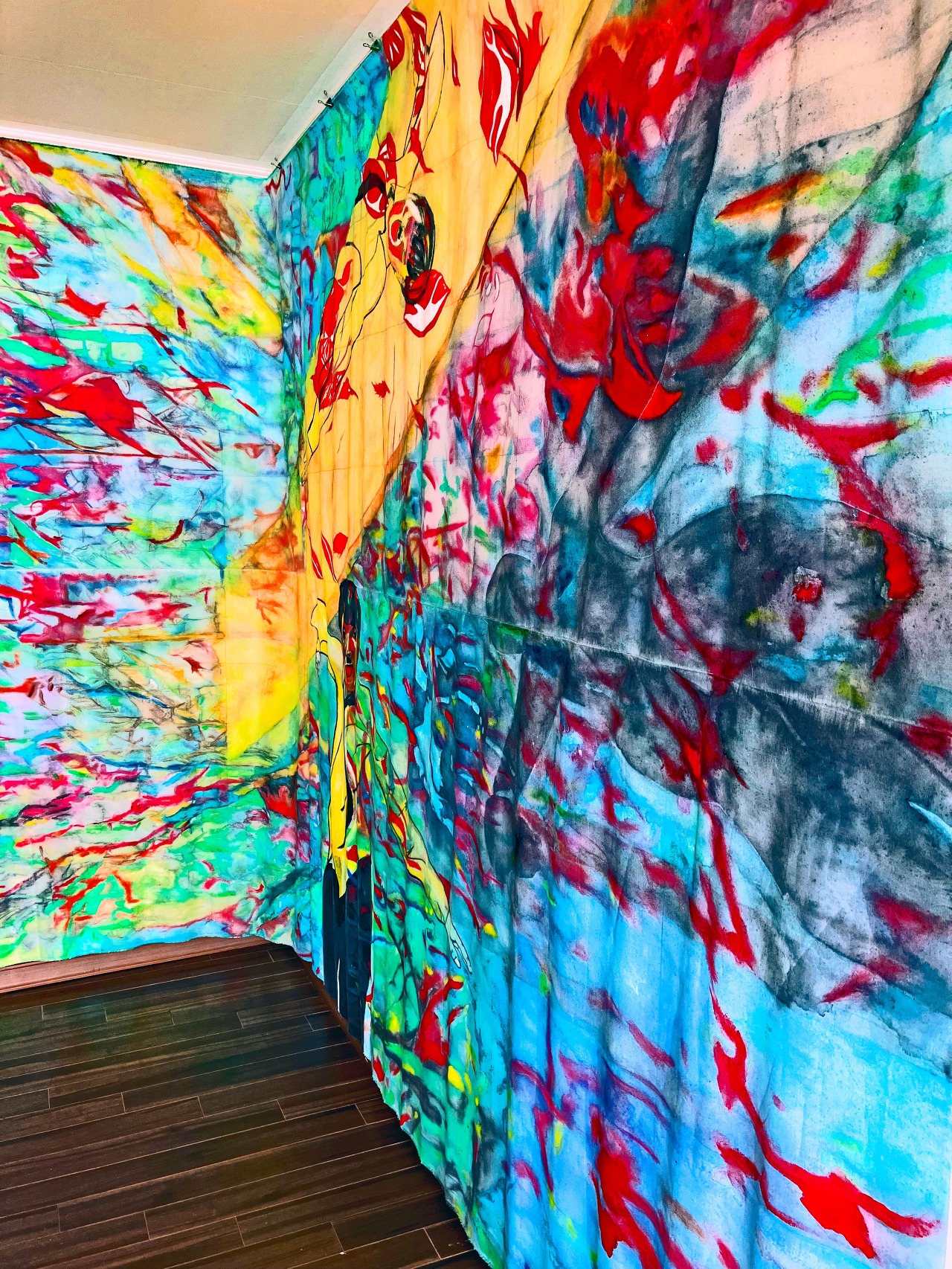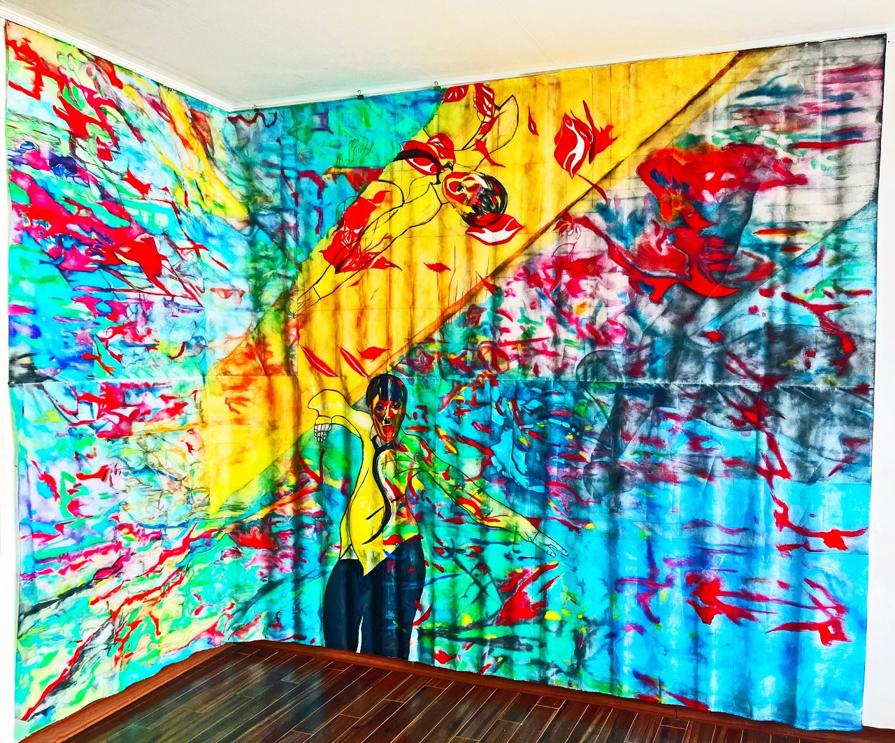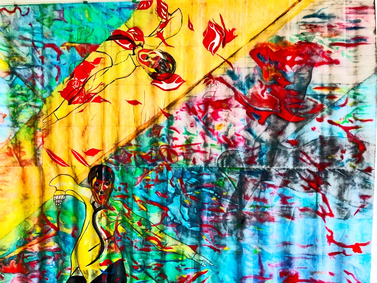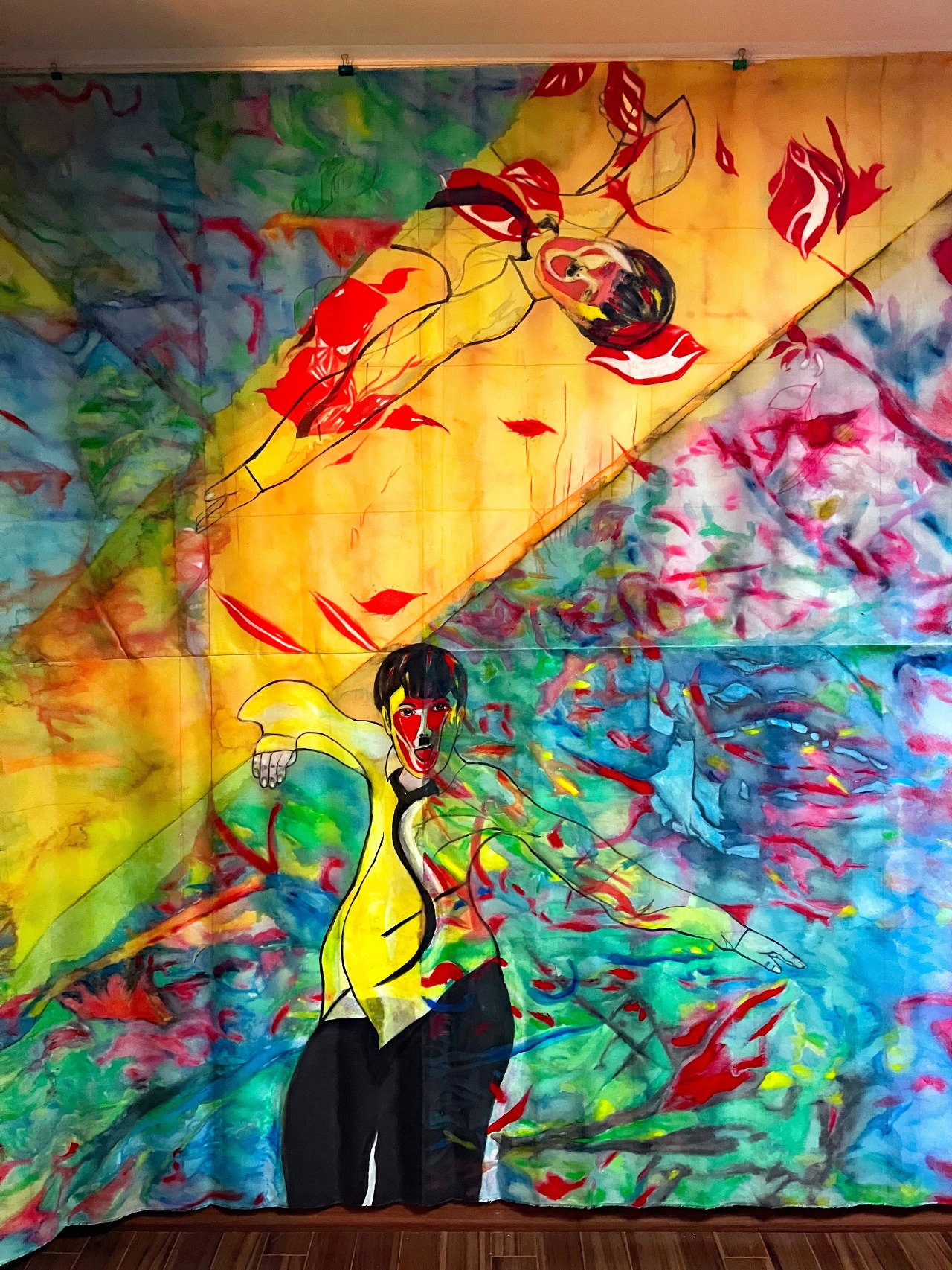 "morning glory window 2024-2-Shadow, 357X225cm, acrylic and composite materials on cloth, 2024" creates an abstract effect in which a dancer who represents the conceptual image of desire hidden in the phenomenal image in the 2023 morning glory poster image overlaps "morning glory" with different backgrounds to give reversible time sensitivity.