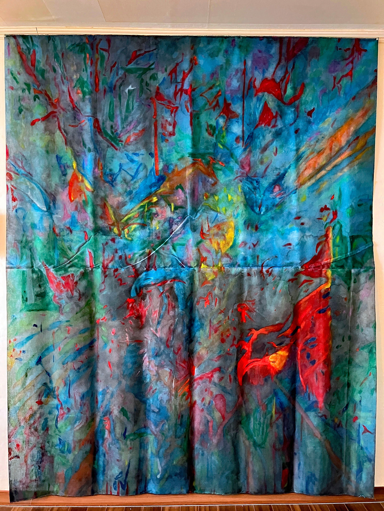 Background image of an artist's artwork: Louis Chul-joo Choi, morning glory window 2024-3-cave painting, 180X318cm, acrylic and composite materials on cloth, 2024