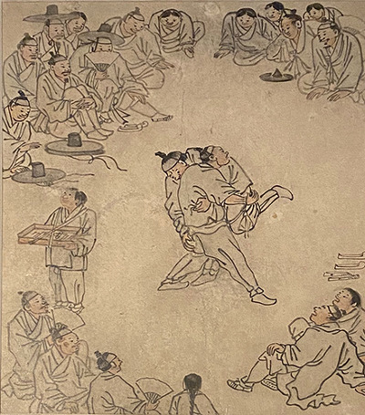 국립중앙박물관은 5월 6일 재개관을 기념하여 단원壇園 김홍도金弘道의 <단원풍속도첩>을 꺼내 들었다. 박물관 측에 따르면 <단원풍속도첩>은 ‘국내외 주요전시에 출품 요청이 끊이지 않고 작품의 보존 때문에 한 번에 여러 점을 감상하기 어려웠다’고 한다. 이번 전시에서는 <씨름>, <무동>, <논갈이>, <활쏘기>, <노상 풍경>, <베짜기>, <그림 감상> 등 7점의 작품을 펼쳐놨다. 희소식은 단발성이 아니라 내년 상반기까지 교체 전시가 이뤄진다는 점이다. 오는 9월 중순에 서당, 빨래터, 담배썰기, 우물, 기와이기, 탁발승이, 내년 1월의 교체 전시에는 타작, 자리짜기, 대장간, 주막, 고누놀이, 행상 등 6점이 등장한다. <단원풍속도첩>에 실린 25점의 작품중 19점이 이번 전시에 공개되는 셈이다.