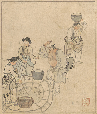15면의 <우물가>에는 굳이 트레머리를 한 젊은 여인에게 물을 얻어 마시며 눈은 뚫어져라 여인을 쳐다보는 저고리를 풀어헤친 남자를 그렸다. 남자는 상투를 틀고 뒷춤에 대충 갓을 매달아 신분을 암시하고 있다. 대낮에 술에 취할만큼 술값 걱정안하는 한량. 반면 어쩐 일인지 트레머리를 한 반반한 여인은 낯선 사내에게 건넨 두레박 끈을 꼭쥐고 있다. 내외하는 사이라면 그 줄을 놓고 외면하고 돌아서도 될일일터. 사내 뒤에는 이미 사단이 난 것을 직감한 중년 여인이 입을 꾹다물고 못마땅한 표정으로 물동이를 인채 채근하듯 서있다. 그림에 등장하는 여인은 모두 세 명이고, 이중 왈짜가 대놓고 쳐다보는 젊은 여인의 물동이와 중년 여인의 물동이만 옹기라 이 둘이 일행임을 알 수 있다. 나머지 한 여인의 물동이는 나무로 만든 것이라 두 여인과 신분이나 경제력에서 차이가 있음을 암시하고 있다.