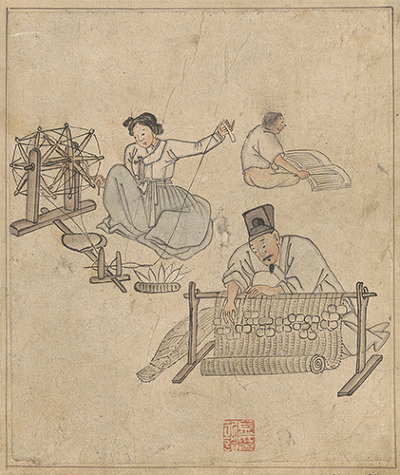 그런데 <자리짜기>에선 어머니는 물레질을 하고 아버지는 자리를 짜고 아들은 글을 읽는 세식구를 다뤘다. 단원은 그림 속에서 머리 모양으로 신분을 나타냈다. 평민 남자는 대충 잡아맨 민상투로 그렸고 양반 계급은 갓이나 망건을 쓴 모습으로 그렸다. 이 그림에서 자리를 짜는 남자는 얌전하게 탕건을 쓴 양반이다. 부부가 물레질을 하고 자리를 짜야만 먹고 살 수 있는 양반은 끈떨어진 잔반일 것이다. 단원은 돈벌이에 나서지도 못하는 잔반의 현실을 그림에 담고 이들이 소망하는 벼슬길에 대한 소망을 글공부하는 아들을 그려넣어 형상화한 것으로 보여진다. 그런데 잔반의 아들은 과거에 급제해 집안을 일으켜 세웠을 것이라고 단원은 믿었을까. 조선 후기 중인과 잔반층을 중심으로 여항문학이 유행하는 등 조선 자체 변혁의 움직임이 있었지만 정조는 집권 후반부로 갈수록 변혁 운동을 막는 쪽으로 움직였다. 문체반정이 그 사례다. 김홍도는 누구보다 정조의 총애를 받았다. 아이러니하게도 정조대부터 세도 정치가 시작되고, 정조 사후 매관매직에 불이 붙었다.