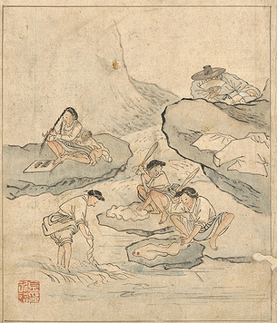 14면의 <빨래터>에선 과감히 배경을 생략했지만 치마를 널어놓고 속곳차림으로 빨래를 하는 아낙네를 훔쳐보는 갓 쓴 양반을 묘사했다. 그가 도둑 고양이처럼 높은 바위에 숨어 부감샷으로 훔쳐보기를 하고 있음을 강조하기 위해 바위를 그렸고 부채로 가린 얼굴에서 빼꼼히 드러난 시선이 머무는 곳이 아낙네의 허벅지임을 강조하기 위해 바위 밑 아낙의 허벅지에 유독 붉은 색을 표나게 올렸다.