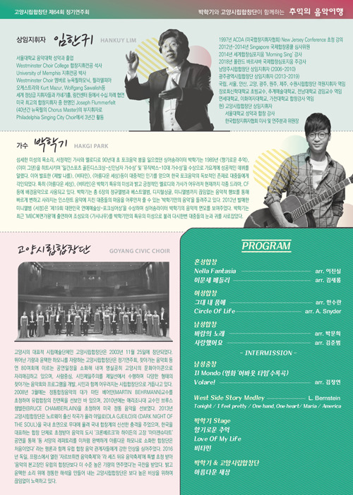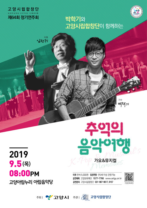 [9월 5일(목)]고양시립합창단 제64회 정기연주회 '박학기와 고양시립합창단이 함께하는' "추억의 음악여행" 작성자고양시립합창단.|작성시간19.08.06|조회수19 목록 댓글 0 글자크기 작게가 글자크기 크게가 다음검색 현재 게시글 추가 기능 열기 북마크 공유하기 신고 센터로 신고 댓글 댓글 0 댓글쓰기 답글쓰기 댓글 리스트