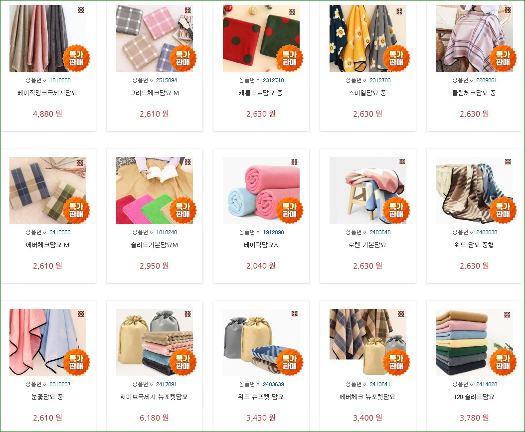베이직담요A (2,040원), 그리드체크담요 M (2,610원), 스마일담요 중 (2,630원) 등 2천 원대 초중반의 실속 있는 상품이 가득! 대량 주문 시 단가 걱정 끝!