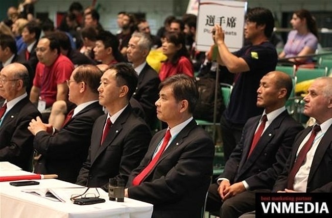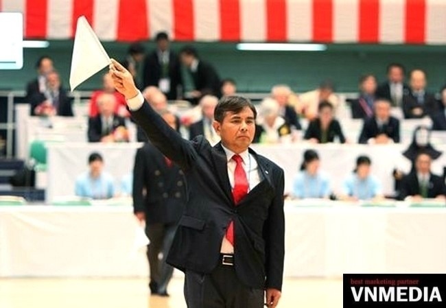사진/ 일본 도쿄 부도칸에서 열린 2015, 제16회 세계검도선수권대회에 참석한 대한검도회 공인 8단 정성대 국제심판(한국중고검도연맹 부회장)의 판정 모습. 정성대 국제심판을 비롯한 한국 국제 심판들의 공정 심판은 전세계 검도인들에게 깊은 인상을 심어주었다.