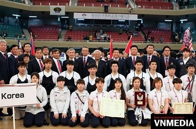 사진/ 제16회 세계검도선수권대회 시상식 후 대한민국 국제 심판들과 임원, 한국대표 남,녀 검도팀 선수들이 기념사진 촬영을 했다. 맨 뒷줄 첫번째 공인 8단 정성대 국제 심판(한국중고검도연맹 부회장).