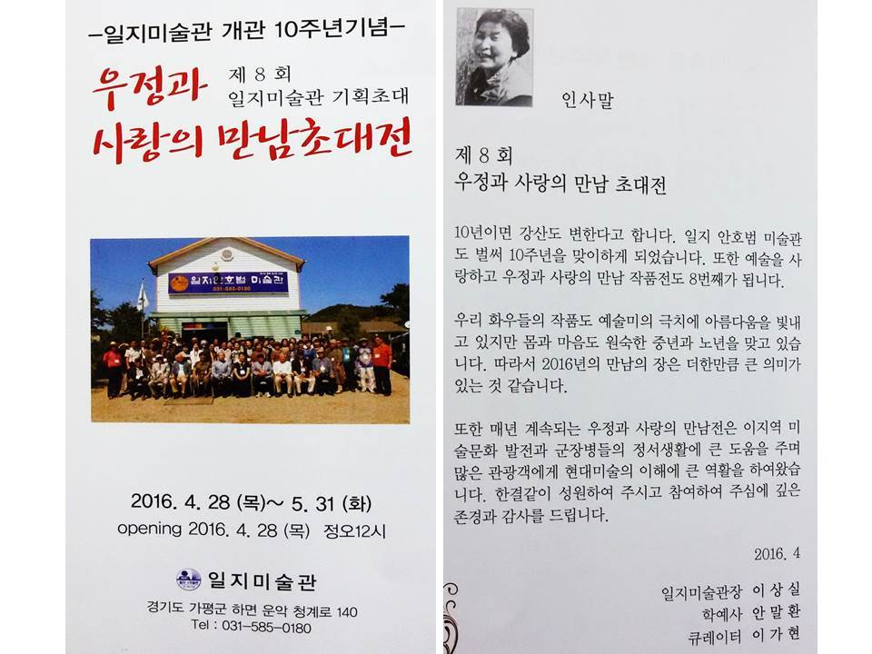 2016 우정과 사랑의 만남초대전 작성자아티스트 김|작성시간16.04.28|조회수128 목록 댓글 0 글자크기 작게가 글자크기 크게가 일지미술관 개관 10주년기념제8회 일지미술관기획초대-우정과 사랑의 만남초대전2016.4.28~5.31. 일지미술관(가평) 다음검색 현재 게시글 추가 기능 열기 북마크 공유하기 신고 센터로 신고 댓글 댓글 0 댓글쓰기 답글쓰기 댓글 리스트