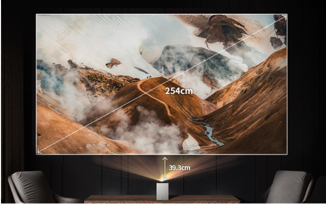 100인치 대화면: 벽에서 약 39.3cm의 거리만 확보해도 최대 100인치의 4K 대화면을 투사할 수 있습니다.