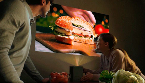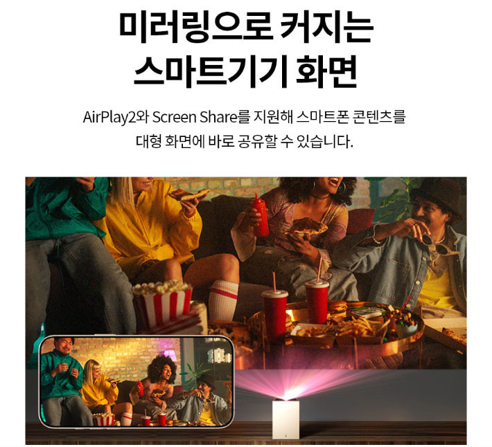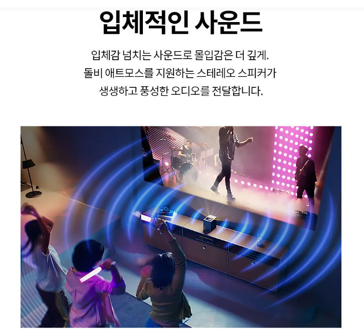 장점: 일반 프로젝터처럼 천장에 매달거나 먼 거리에 둘 필요가 없어 설치가 간편하고, 화면 앞에 사람이나 물건의 그림자가 생기는 현상이 거의 없습니다.