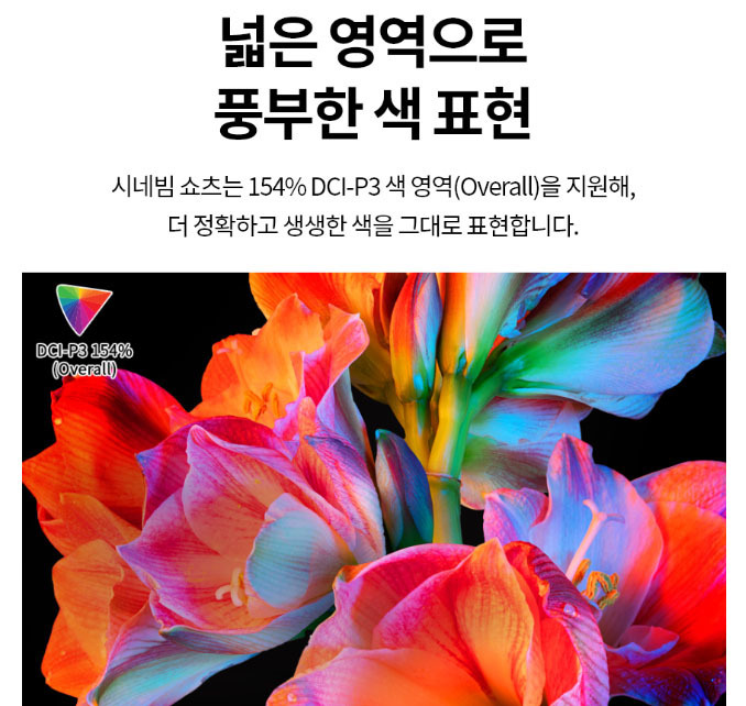 색 재현력: 디지털 영화협회(DCI) 색 영역인 DCI-P3를 154% 충족하여 풍부하고 정확한 컬러를 표현합니다.