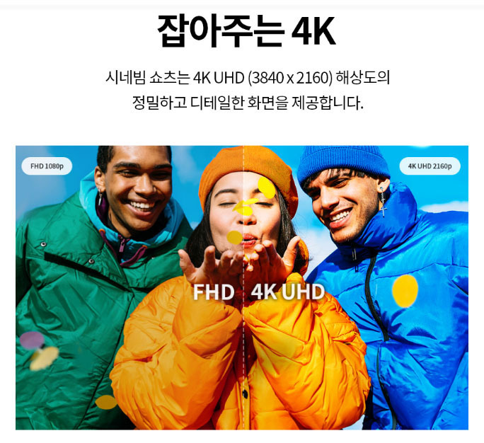 4K UHD 해상도: $3840 \times 2160$의 고해상도를 지원하여 선명하고 디테일한 화질을 제공합니다.