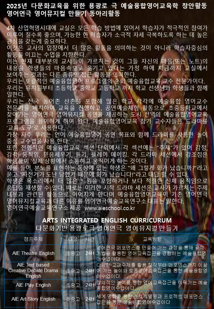 2025년 창체동아리 활동 다문화교육을 위한 용광로 극 다문화주제 예술융합영어교육학 창안활동 영어연극 영어뮤지컬 만들기 동아리활동 작성자ARTSMAMAGER|작성시간25.03.25|조회수33 목록 댓글 0 글자크기 작게가 글자크기 크게가 다음검색 현재 게시글 추가 기능 열기 북마크 공유하기 신고 센터로 신고 댓글 댓글 0 댓글쓰기 답글쓰기 댓글 리스트
