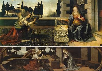 시대의 천재 레오나르도 다 빈치(Leonardo da Vinci)가 그린 수태고지 장면은 특이하게도 실외를 배경으로 옆으로 길게 그려졌는데, 상상력이 가미된 인물들의 제스처에서 그의 개성을 느낄 수 있다. 이 작품은 같은 공방 출신의 로렌조 디 크레디(Lorenzo di Credi)의 수태고지에 많은 영향을 준 것으로 보이는데, 가로로 긴 화면과 인물의 구성 등에서 유사점을 찾아볼 수 있다.