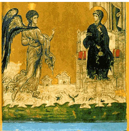 12세기 말 경에 제작된 이콘(Icon)의 수태고지 장면, 성 카타리나 수도원(St. Catherine Monastery) 소장 천사 가브리엘과 마리아의 발 아래로 3월의 봄을 알리는 듯, 풀밭을 노니는 새들과 흐르는 냇물 위로 뛰어오르는 물고기들이 보인다. | |