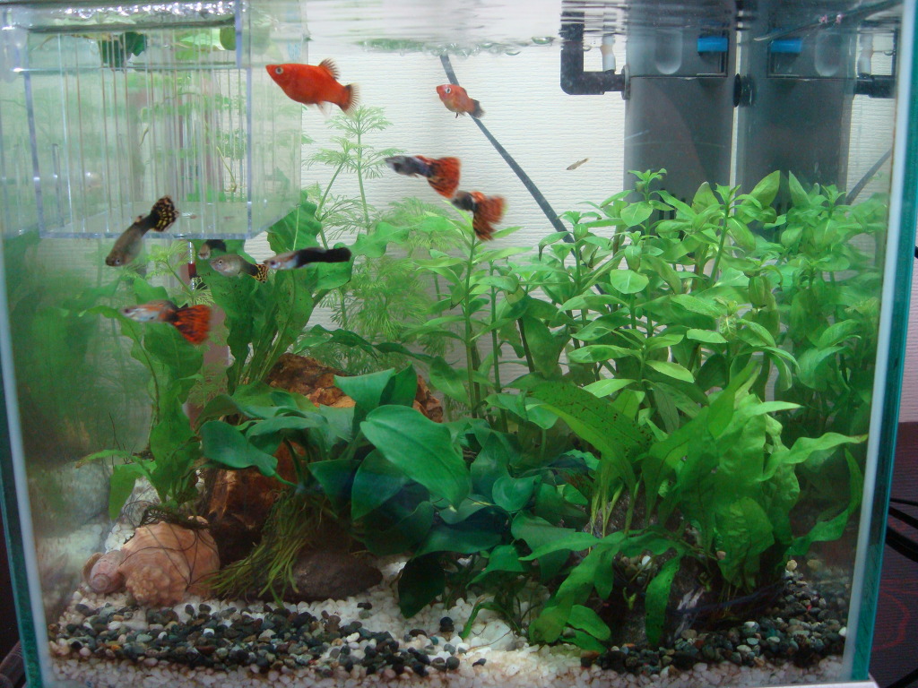 원래는 플래티5마리(암수구분이 안되는지라..) 구피암수5쌍.비파1마리를 키우고 있었죠.