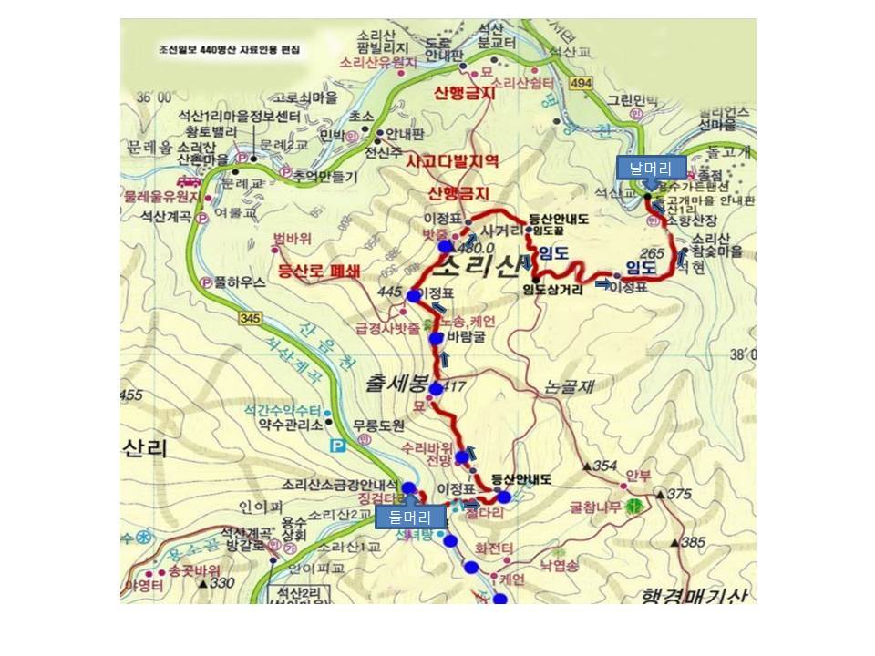 * 코스 : 소리산 소금강 안내석~철다리~수리바위~출세봉~바람굴~소리산정상~