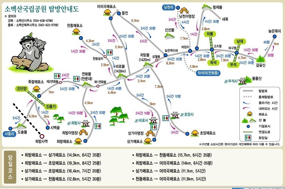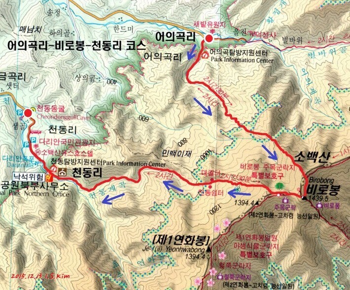 * 코 스 : A: 어의곡리 탐방센터 - 비로봉 - 천동탐방센터
