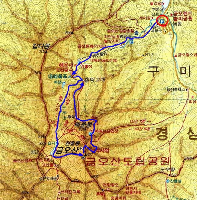 A 코스: 탐방안내소 - 금오산성 - 대혜폭포 - 성안 - 정상 - 약사암- 탐방안내소 (7.9km 4H 30)