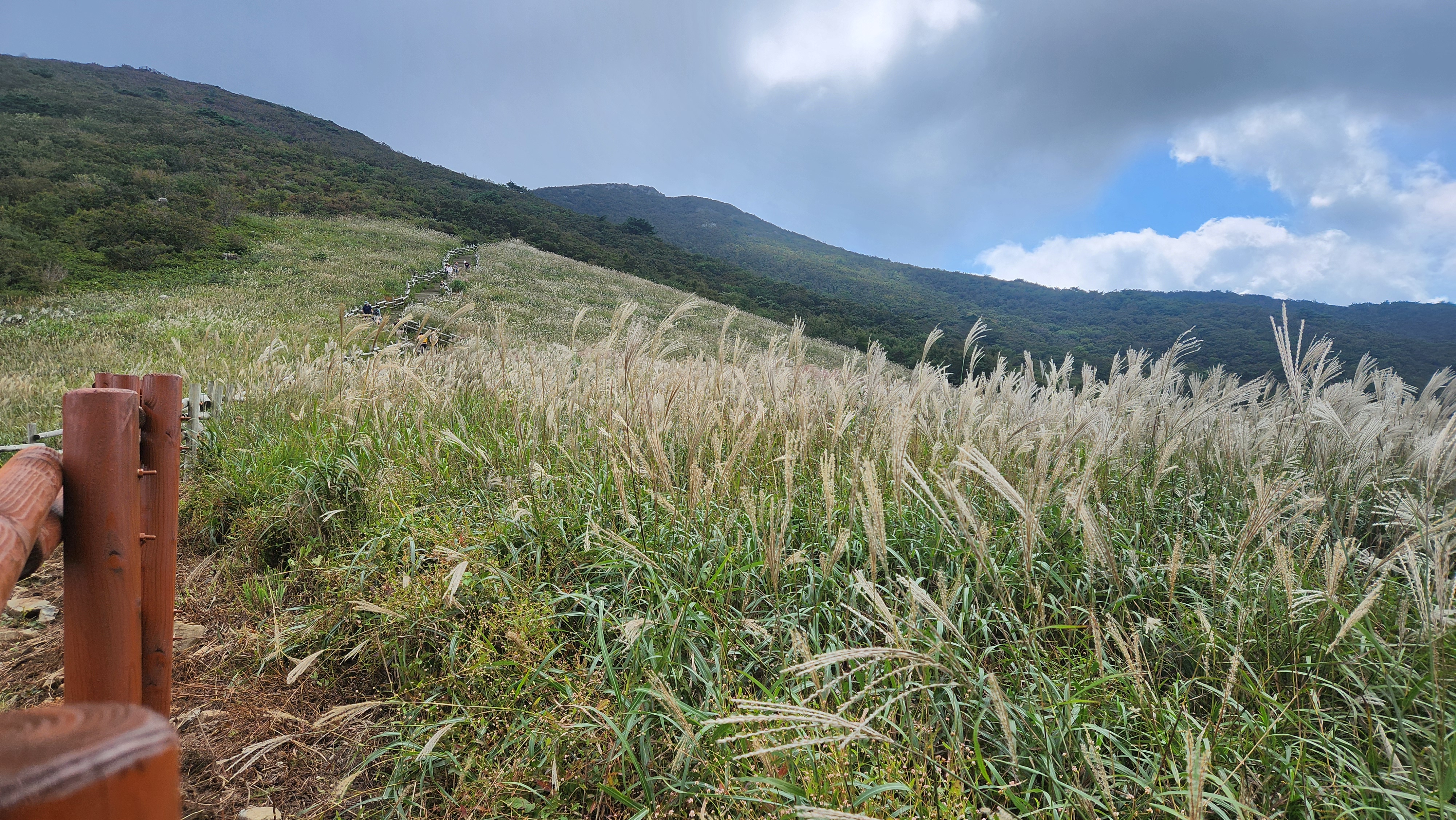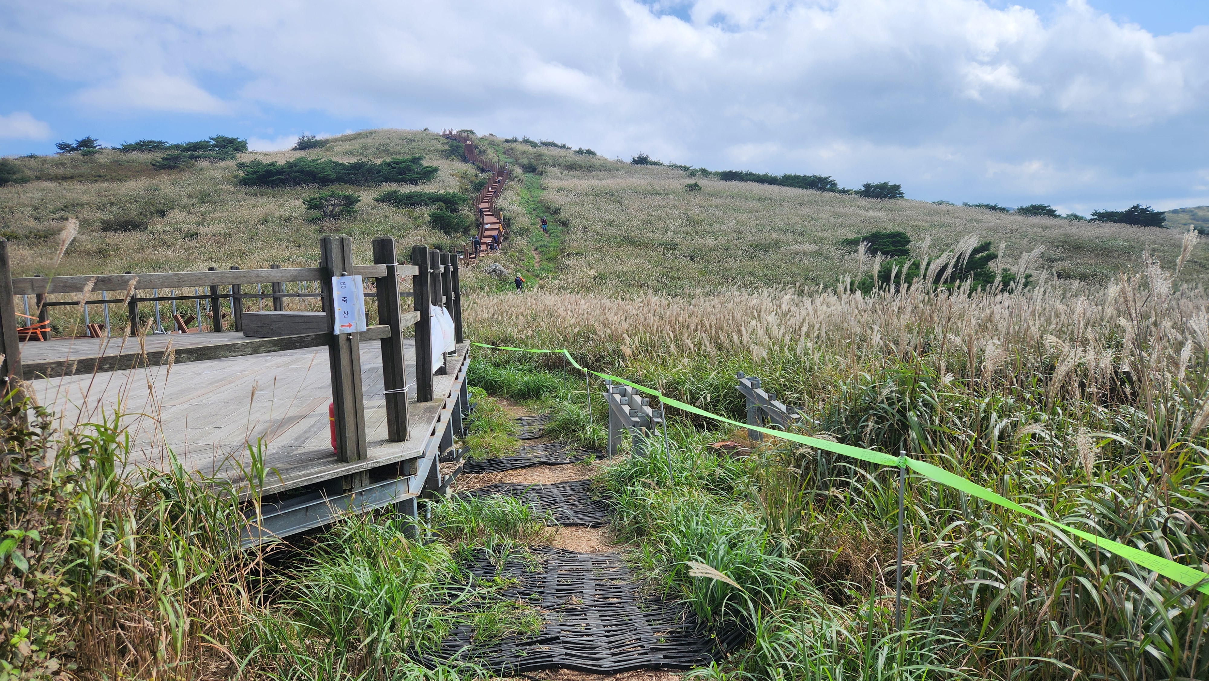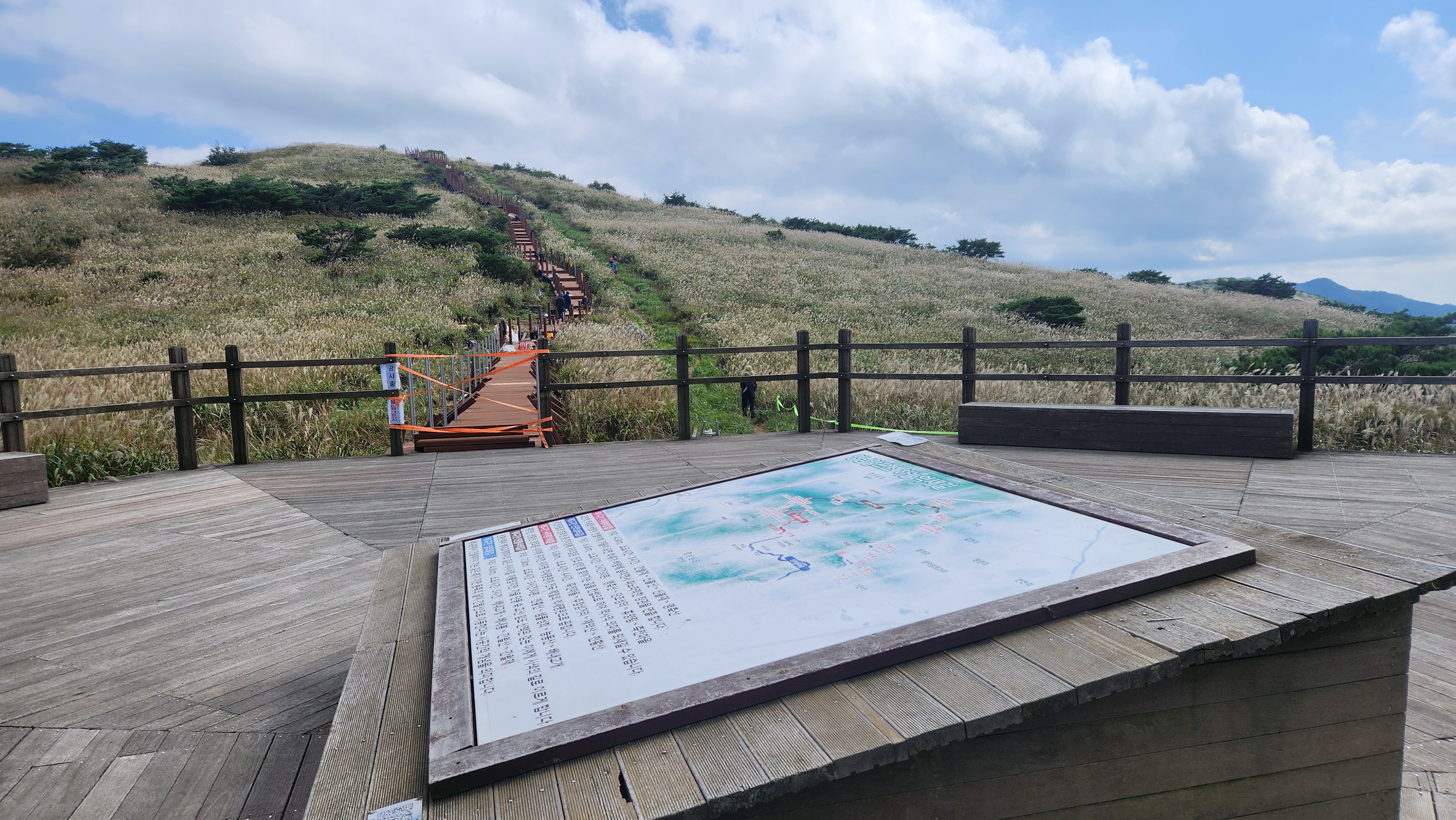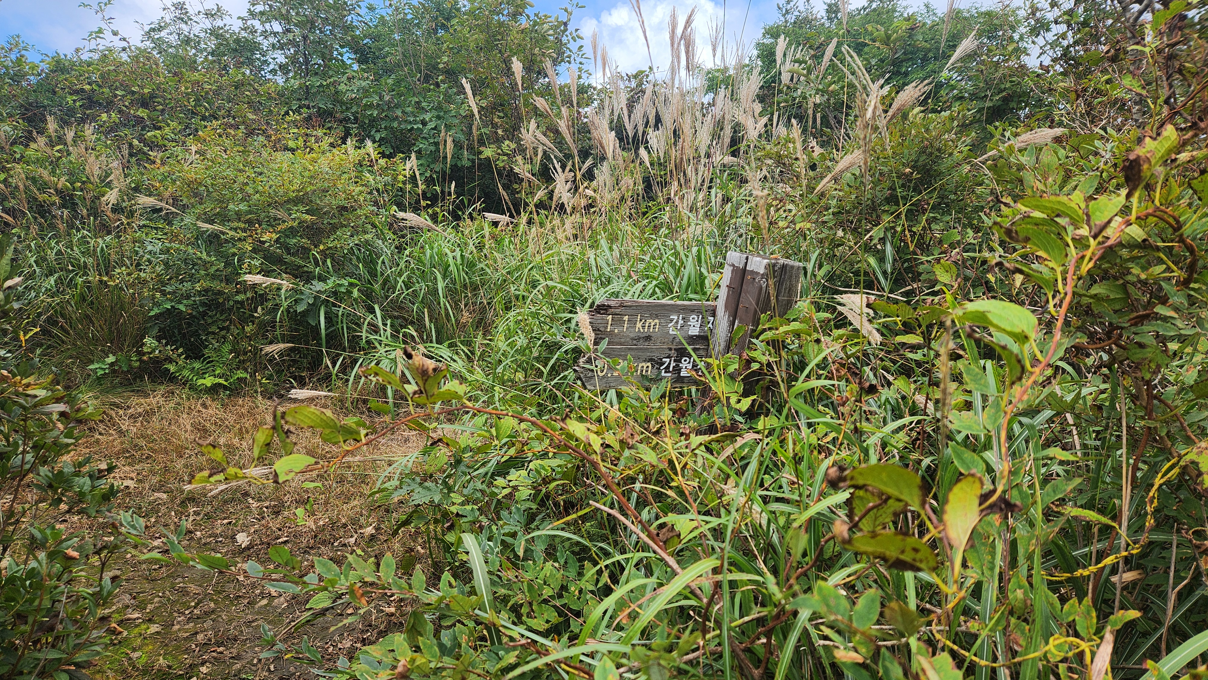 | 영축산을 먼저 오를까...간월산을 먼저 오를까... 고민히다 내려와 차편이 편한...간월산을 먼저 향한다... 간월산에서 내려보니 역새가 안핀 것 같이 보였는데... 아니다...내려와 보니 한창 만개돼...좋다... 신불산오르는 테크와...신불재에서... 간월산 오르는 테크길 공사가 진행중이다... 그런데 우리는 이상하게도 테크길보다... 임시로 만든 길이 더 좋다... |