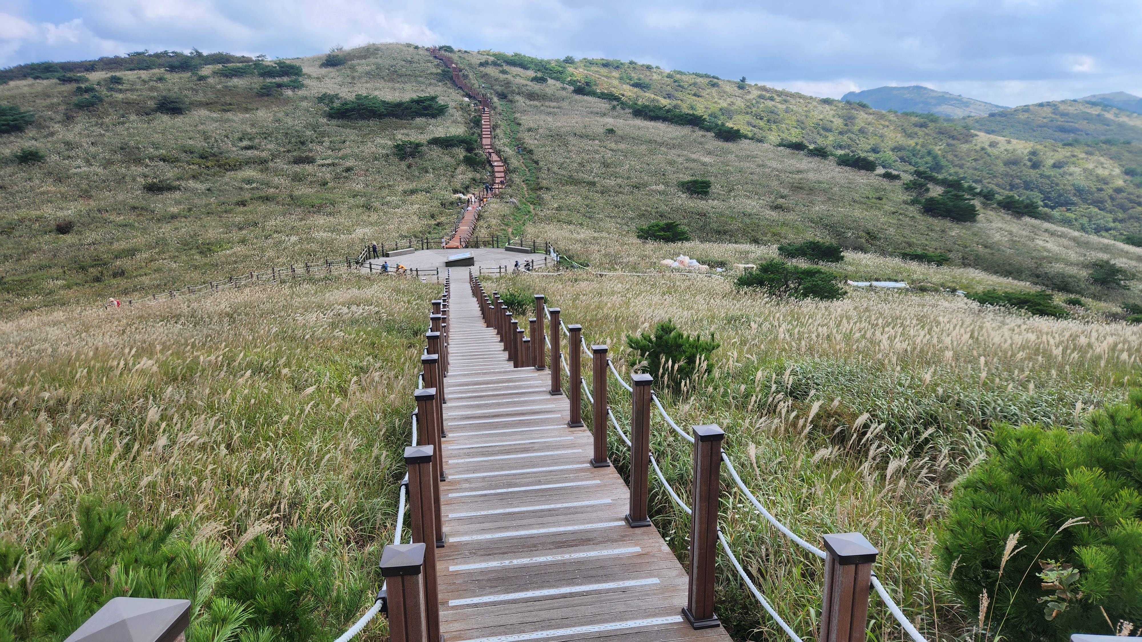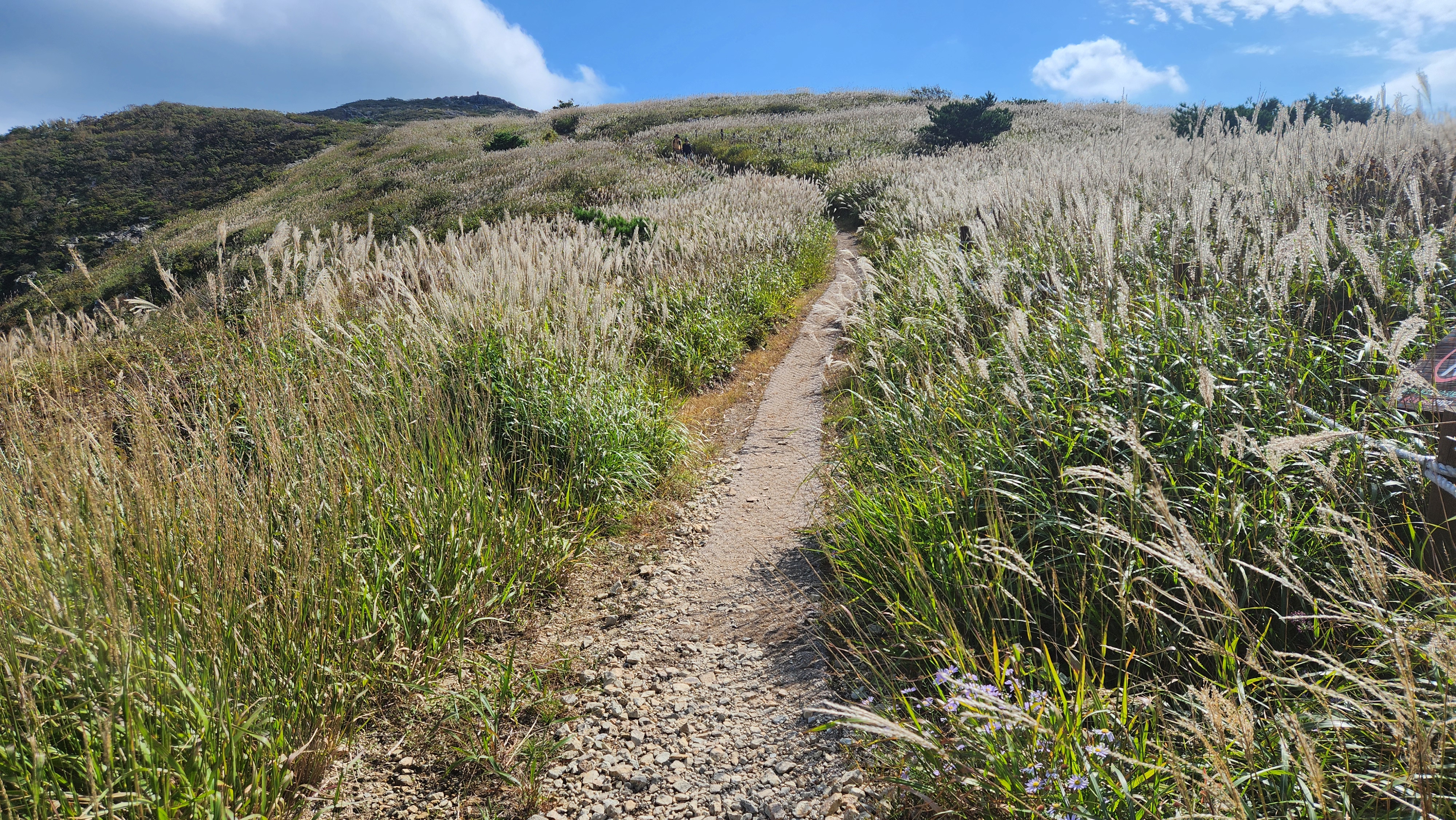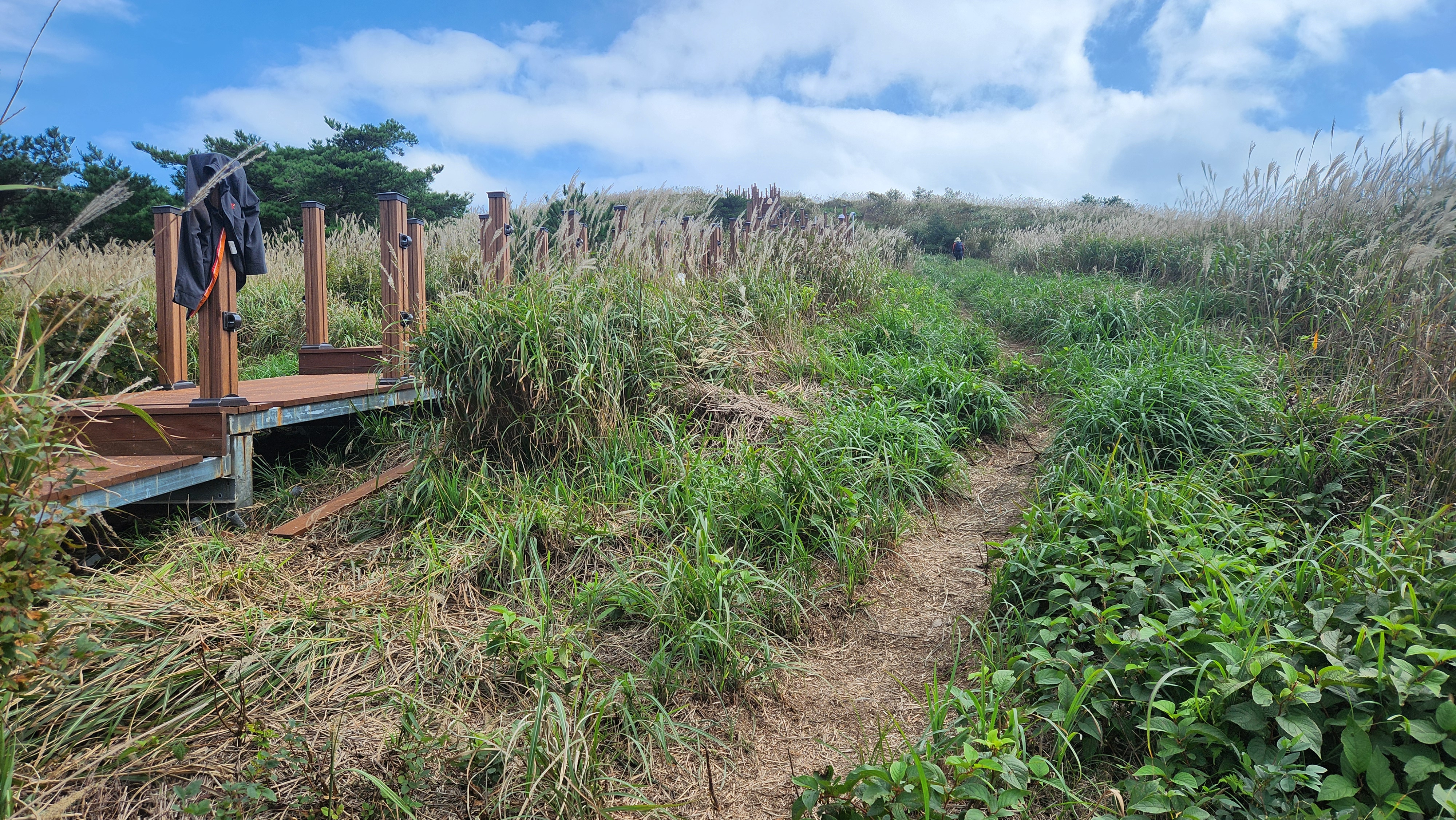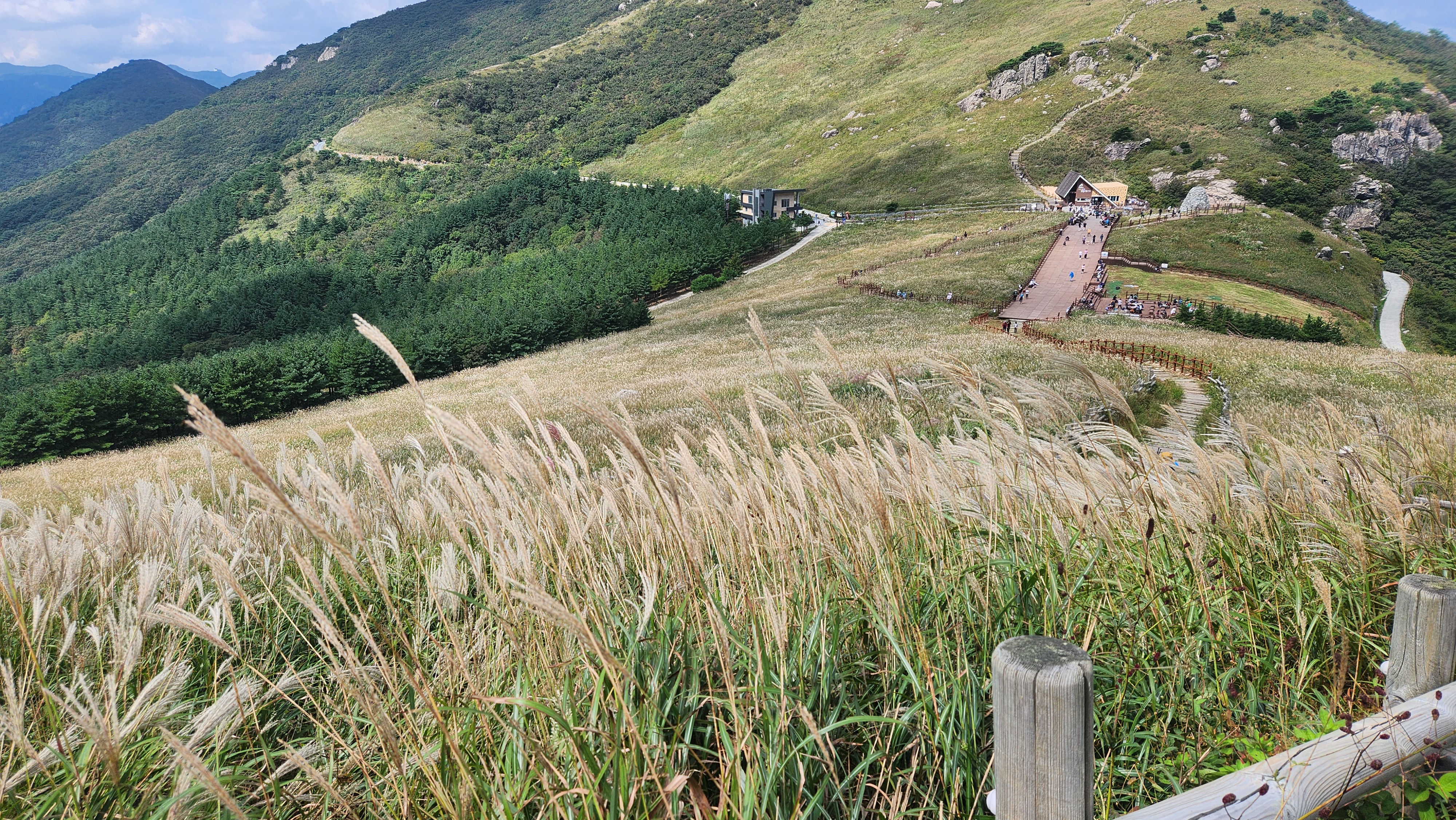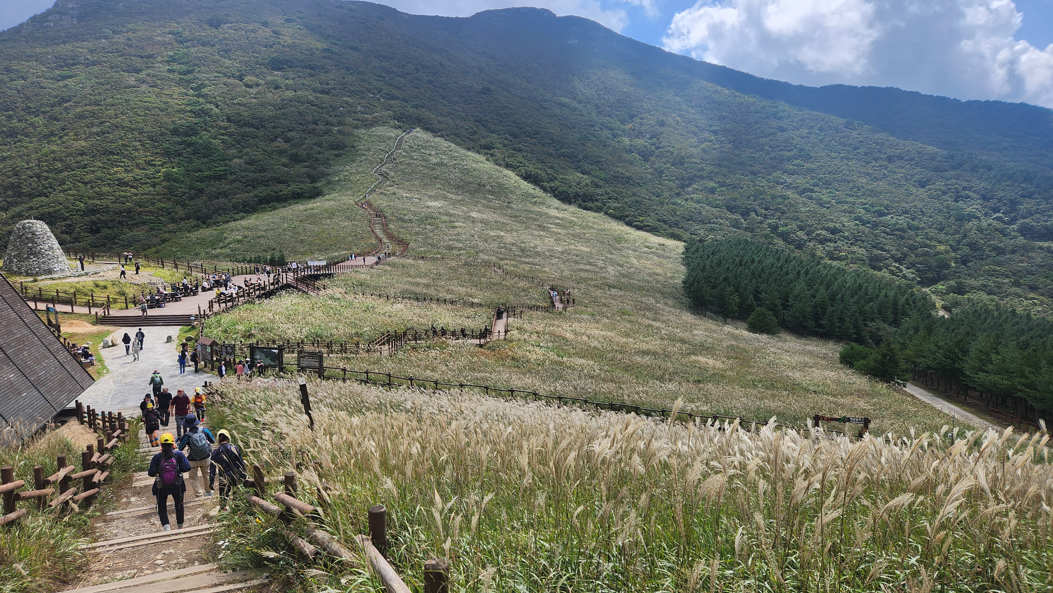 | 영축산을 먼저 오를까...간월산을 먼저 오를까... 고민히다 내려와 차편이 편한...간월산을 먼저 향한다... 간월산에서 내려보니 역새가 안핀 것 같이 보였는데... 아니다...내려와 보니 한창 만개돼...좋다... 신불산오르는 테크와...신불재에서... 간월산 오르는 테크길 공사가 진행중이다... 그런데 우리는 이상하게도 테크길보다... 임시로 만든 길이 더 좋다... |