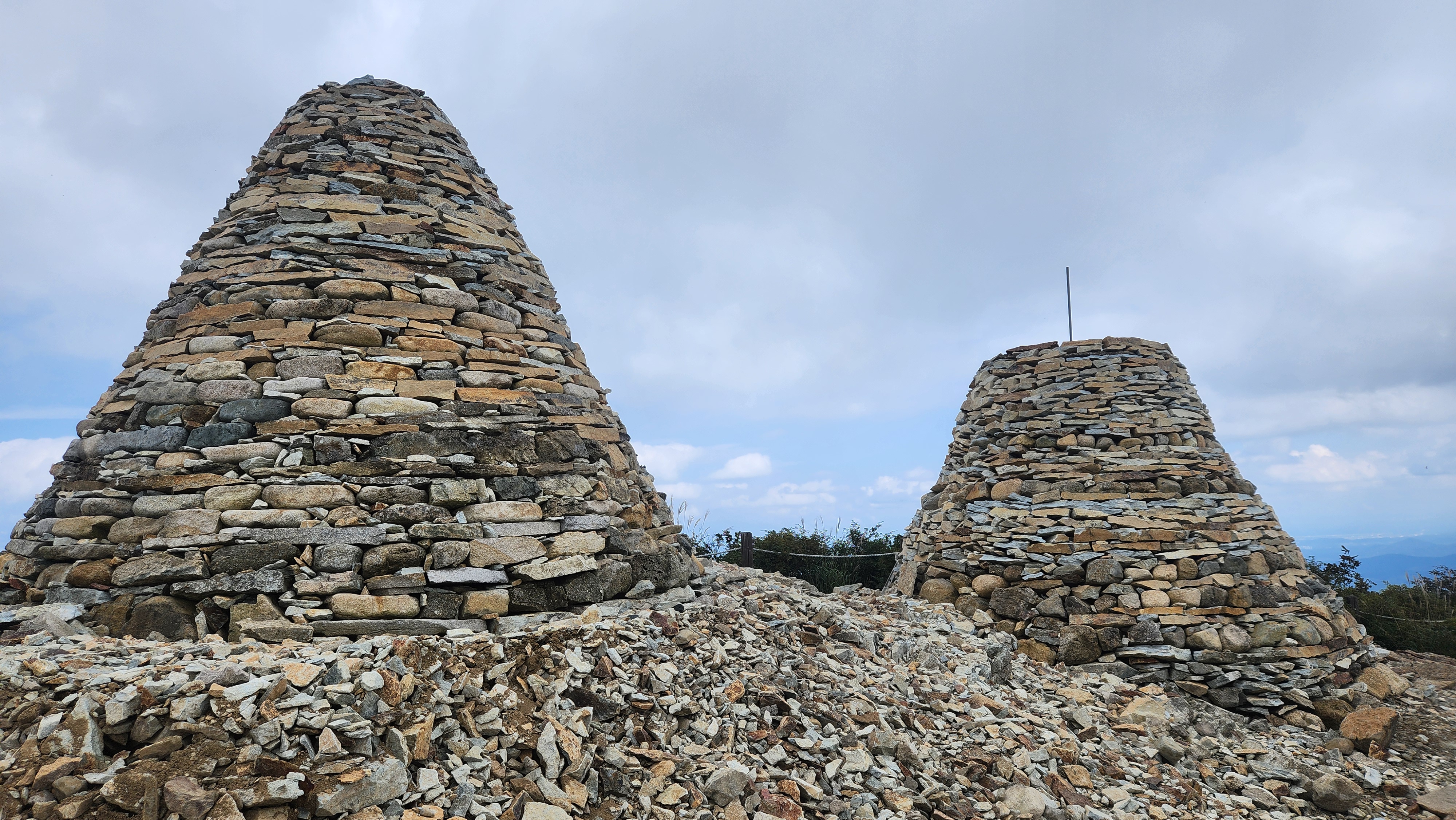 | 13:39 - 신불산(1,159) 정상석을 터치하고 전망을 본다...돌탑을 두개를 쌓는 중이다... 13:41 - 아랫쪽 정상석... 13:45 - 영축산을 본다... 13:57 - 신불재를 내려본다... |