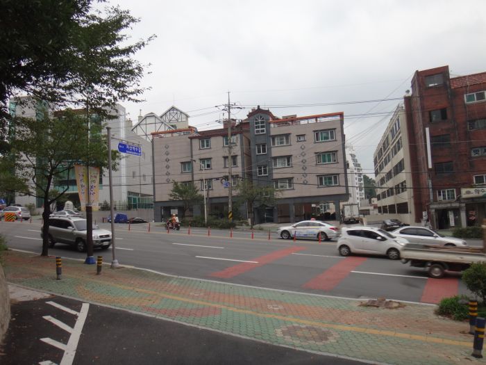 큰도로에 내려선다...건너편 합포고등학교쪽에 버스정류장이 있단다... 횡단보도를 건너기 위해 오른쪽으로 ...공기털이가 있어 바지를 털고...