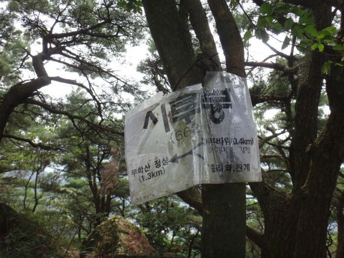 나무에 시루봉이라고 정상표시를 누군가 해놓았다.... 13:43 - 이정표-정상1.2... 14:05 - 날이 흐려 그렇지 맑았으면 땡볕구간이다...