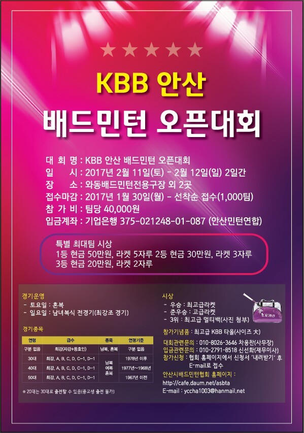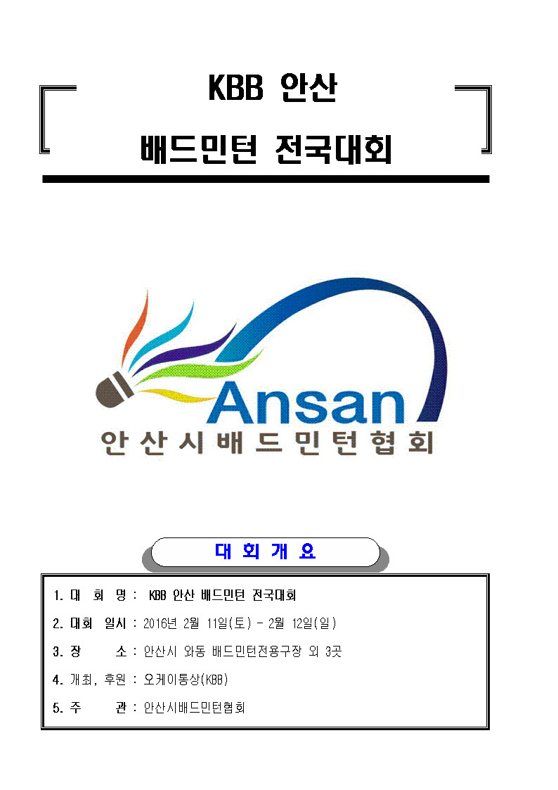 KBB 안산 배드민턴 전국대회를 아래와 같이 개최하고자 하오니 전국 동호인 여러분들의 뜨거운 성원 부탁드립니다.