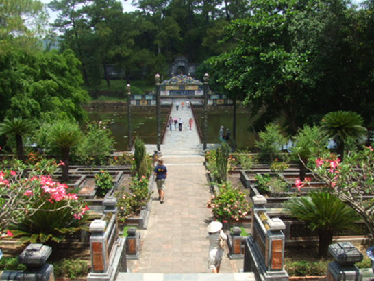 카이딘 왕릉 카이딘 왕릉((Lang Khai Din)은 응엔 왕조의 마지막 왕릉으로 1920년에 공사가 시작되어 카이딘 왕의 사후 6년인 1931년에나 완공된 무려 12년에 거쳐 건축되었다. 베트남과 유럽의 건축양식이 절묘하게 섞인 특이한 구조의 왕릉으로 콘크리트 석상의 경우 유럽인의 모습과 유사하다. 서구식 건축에 예술적으로도 우아한 멋을 내고 있는 이곳은 다른 릉과는 다르다. 돌계단 난간에는 용이 새겨져 있으며 계단 위에는 말과 코끼리 그리고 관리의 석상이 세워져 묘를 지키고 있고 묘 뒤에는 황제의 위업을 기리는 2충짜리 작은 석당이 있다. 내부의 옥좌에는 청동에 금박을 입힌 황제의 등신상이 있으며 그 아래 황제의 시신이 안치돼 있다. 특히 벽과 천장은 자기와 유리로 스테인드 그라스처럼 장식되어 있는데 그 아름다움은 방문자의 시선을 빼앗는다.